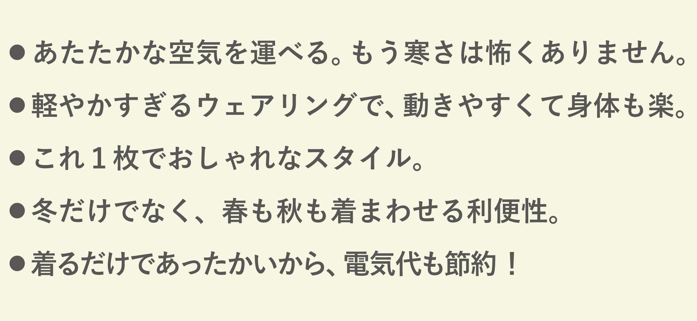 しかし、冬の寒さに対応した「保温性」、冬を軽やかにする「軽量性」、気持ちよすぎる「心地よい触感」、室内ではもちろん外着としてもオシャレな「美しさ」、楽すぎる取り扱いでまるで時間を買うような「利便性」。