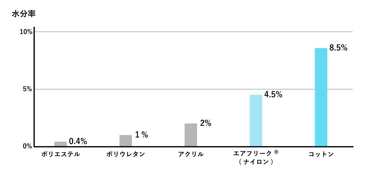 一方、ナイロン素材の水分率は約4.5%。ポリエステルの10倍以上の水分率を持ち、合繊素材の中で水分率はもっとも高いレベルです。
