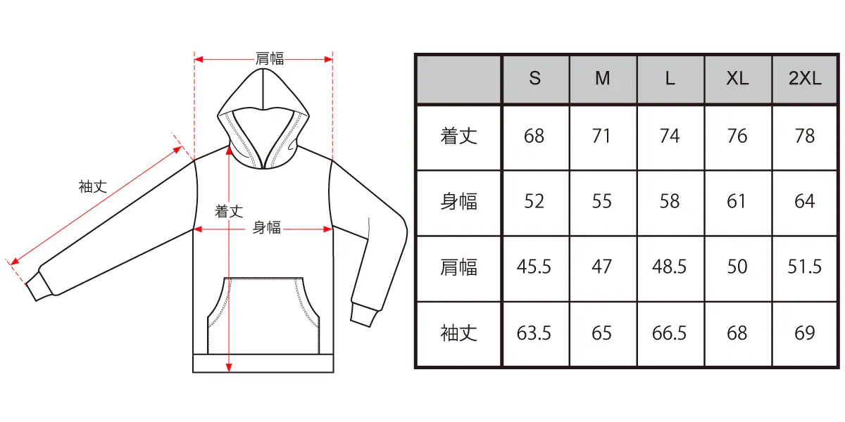 A:サイズ表に詳細サイズを記載致しましたので、お持ちの服と比較しながらご検討くださいませ。洗濯にてタテ方向に若干の縮みが発生しますので、初期設定は身丈、袖丈は少し長めの設定となっています。