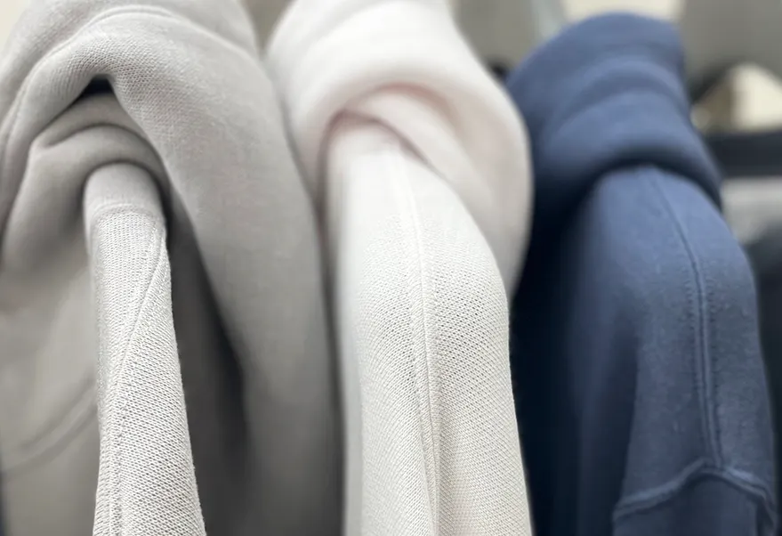衣料品では、スウェットやフリースなどの起毛素材や、中綿・ダウン商品など、いかに空気を衣服の中に取り込むかが「保温性=あたたかさ」を左右します。