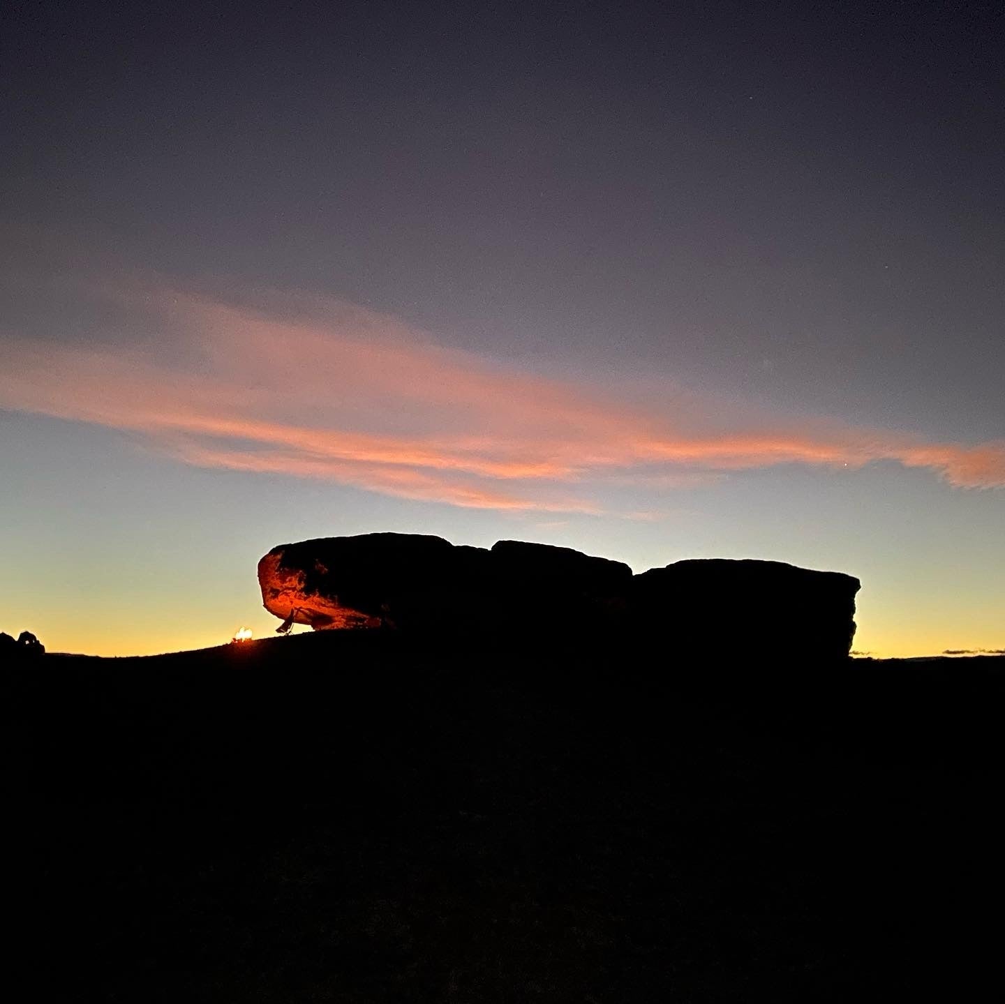 ファクトリービュートという場所にあった大きな岩で、風を避けて焚き火をする様子
