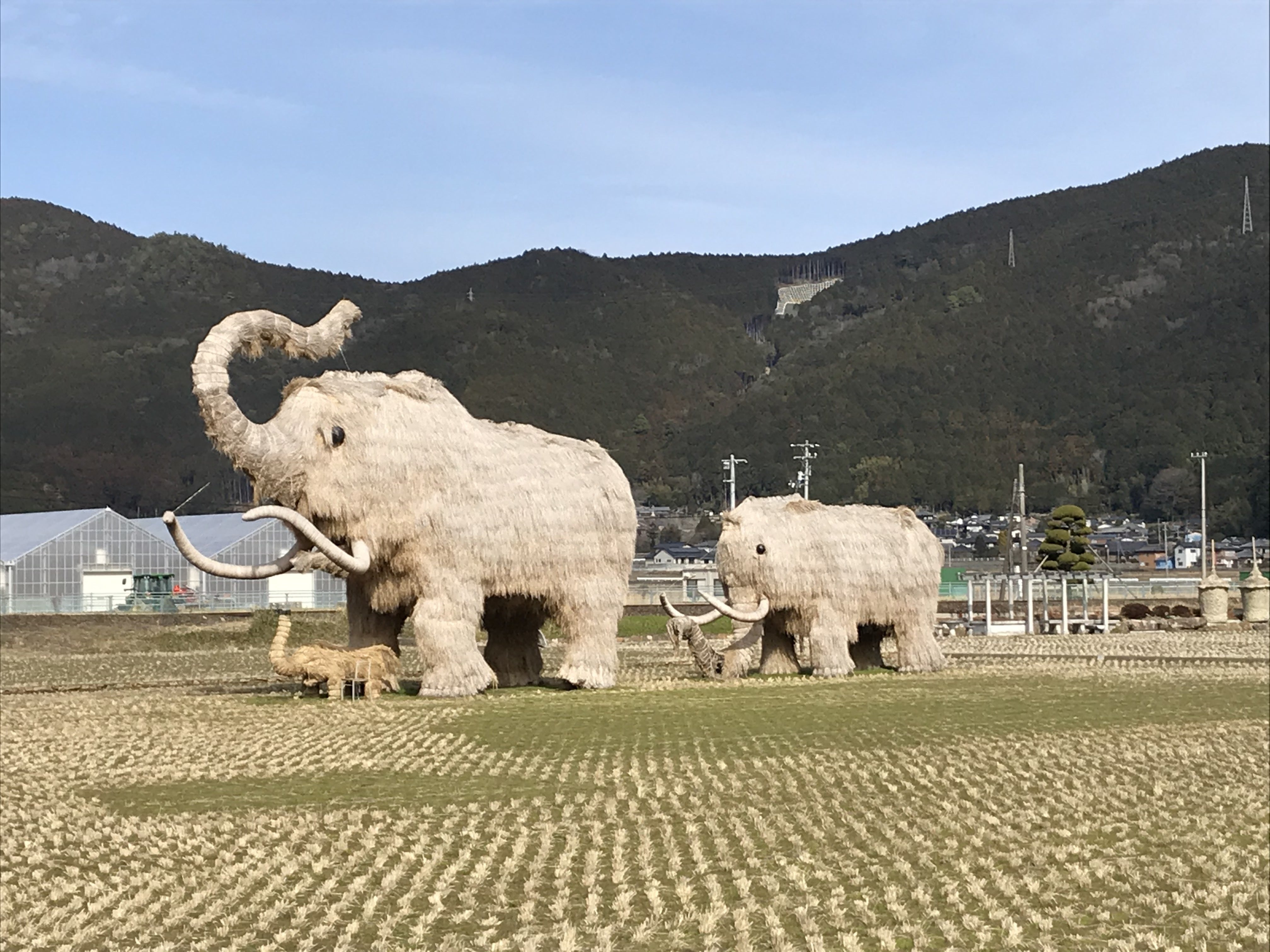 皆様ありがとうございます!ついに50%を超えました!!西予市のわらマンモスも鼻を上げて喜んでおります♪蔵のある宇和町は愛媛県内でも有数の米どころなので、稲わらを乾燥させるために「わらぐろ」という三角帽子のような(写真の右端に小さく写っているものです)造形物があります。そのわらぐろの文化から派生した名物がわらマンモスです。近くで見るとかなり大きくて迫力があるので宇和町に来た際には必見です!話は逸れましたが(笑)引き続き頑張りますので、よろしくお願いいたします!