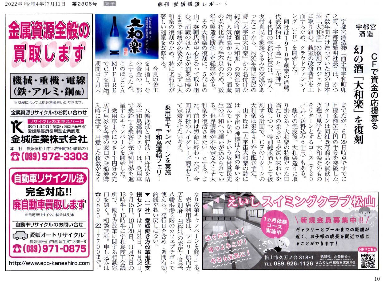 台風4号は温帯低気圧に変わりましたが、ご支援は着々といただいており、今現在目標に対して進捗81%まで来ました!本当に感謝です!!クラウドファンディングが公開された直後に愛媛経済レポートさんからご連絡をいただき、掲載していただく事になりました♪週刊誌にまで掲載してもらい、感謝の気持ちと共に皆様の期待に応えるためのパワーがみなぎって来ました!