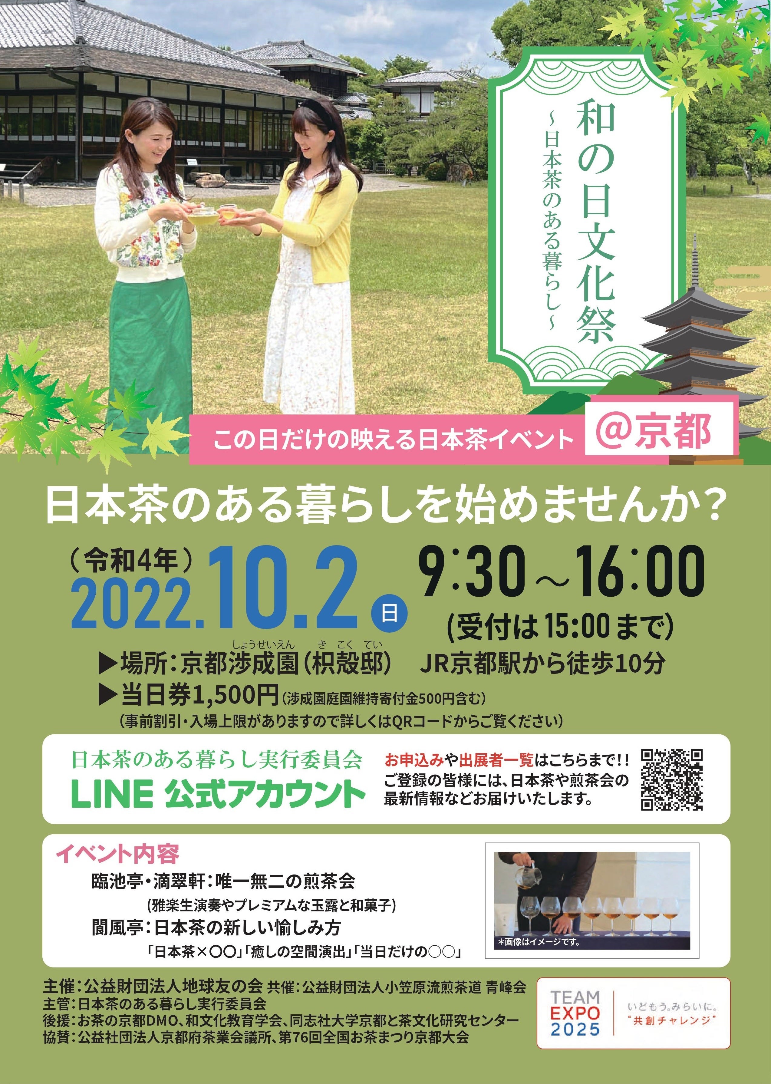 そして、その第1弾イベントとして、2022年(令和4年)10月2日(日)に京都の渉成園をお借りして和の日文化祭~日本茶のある暮らし~を開催する運びとなりました。(*京都渉成園はJR京都から徒歩10分と近く、煎茶に所縁ある素敵な場所です。)