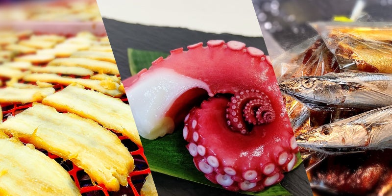(ゆで蛸:1/2匹 干物:秋刀魚、鯖など2パック4尾 干し芋:紅あずま入り4パック、干し芋各種8パック)