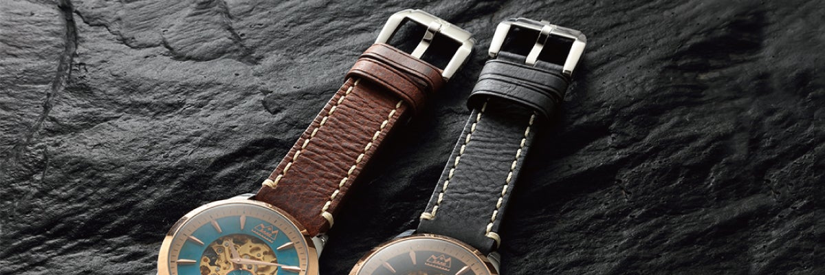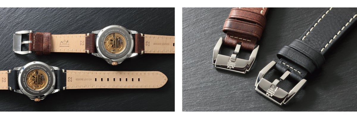 それぞれのモデルに取り付けているレザーバンドには、十分に油分を含ませたイタリアンシュリンクレザーを使用しています。油分を含んでいるからこそ艶感が増していきます。