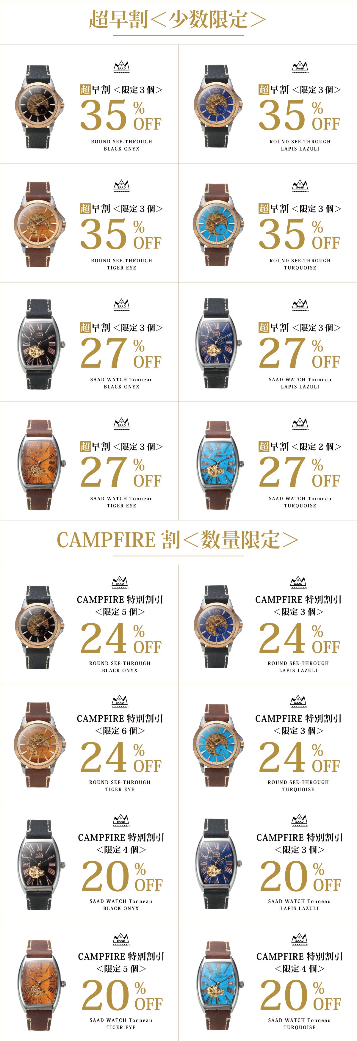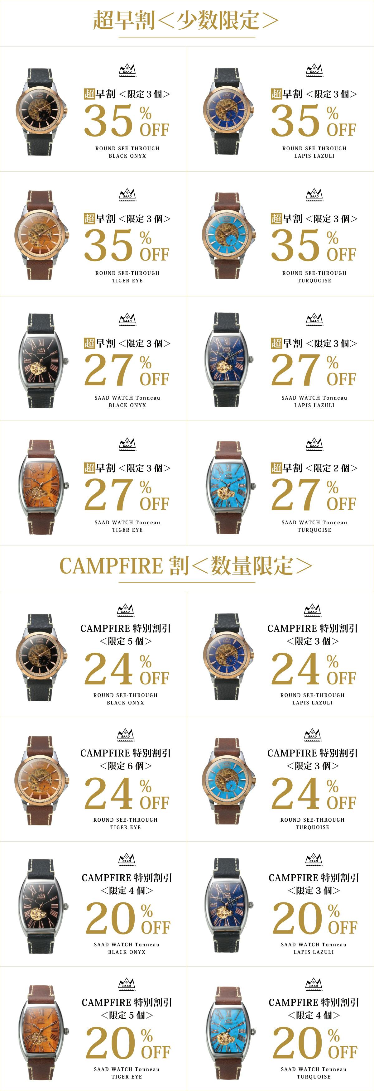2022/08/13 13:00日々ご支援・応援をいただき誠にありがとうございます。プロジェクト終了まで残り2日となります。8/13(土)12:00現在のリターン残り数をご報告いたします。各種残り僅かとなっておりますのでお早めにご検討くださいませ。数量限定【SAAD WATCH】リターン残数状況 ※8/13 13:00時点▼残り2個/超早割35%OFF(ラウンドシースルー/ターコイズ)定価91,800円→59,670円(税・送料込み)▼残り5個/CAMPFIRE割24%OFF(ラウンドシースルー/ブラックオニキス)定価91,800円→69,768円(税・送料込み)▼残り1個/CAMPFIRE割24%OFF(ラウンドシースルー/ タイガーアイ)定価91,800円→69,768円(税・送料込み)▼残り3個/CAMPFIRE割24%OFF(ラウンドシースルー/ターコイズ)定価91,800円→69,768円(税・送料込み)▼残り4個/CAMPFIRE割20%OFF(サードウォッチトノー/ブラックオニキス)定価81,800円→65,440円(税・送料込み)▼残り5個/CAMPFIRE割20%OFF(サードウォッチトノー/タイガーアイ)定価81,800円→65,440円(税・送料込み)▼残り2個/CAMPFIRE割20%OFF(サードウォッチトノー/ターコイズ)定価81,800円→65,440円(税・送料込み) もっと見る
