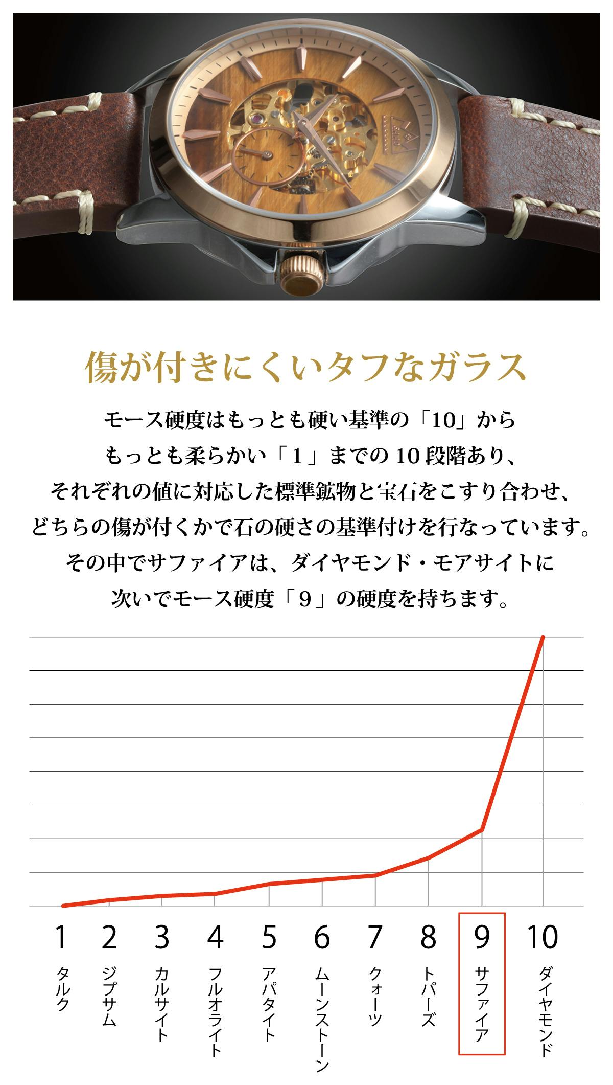 サファイアガラスはサファイアクリスタルを人工的に加工したもので、宝石の硬さを1~10の尺度に分けるモース硬度において最高クラスの「9」評価を受けている素材です。非常に硬い素材のため傷にも圧倒的に強い素材となります。