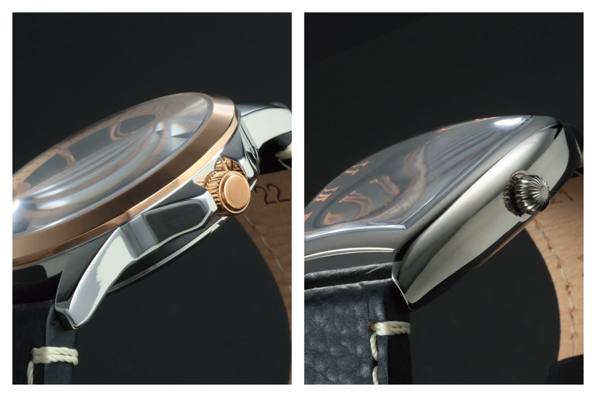 内部機械とのカラーバランスを重要視し、ステンレスフレームにはツートーンカラーを採用した上品な仕上がり。