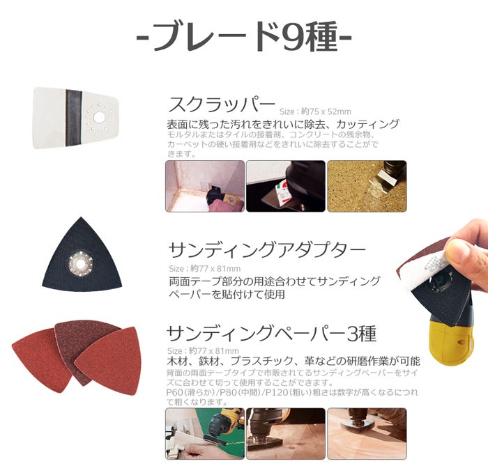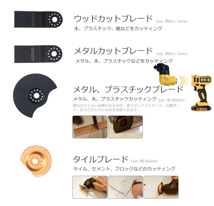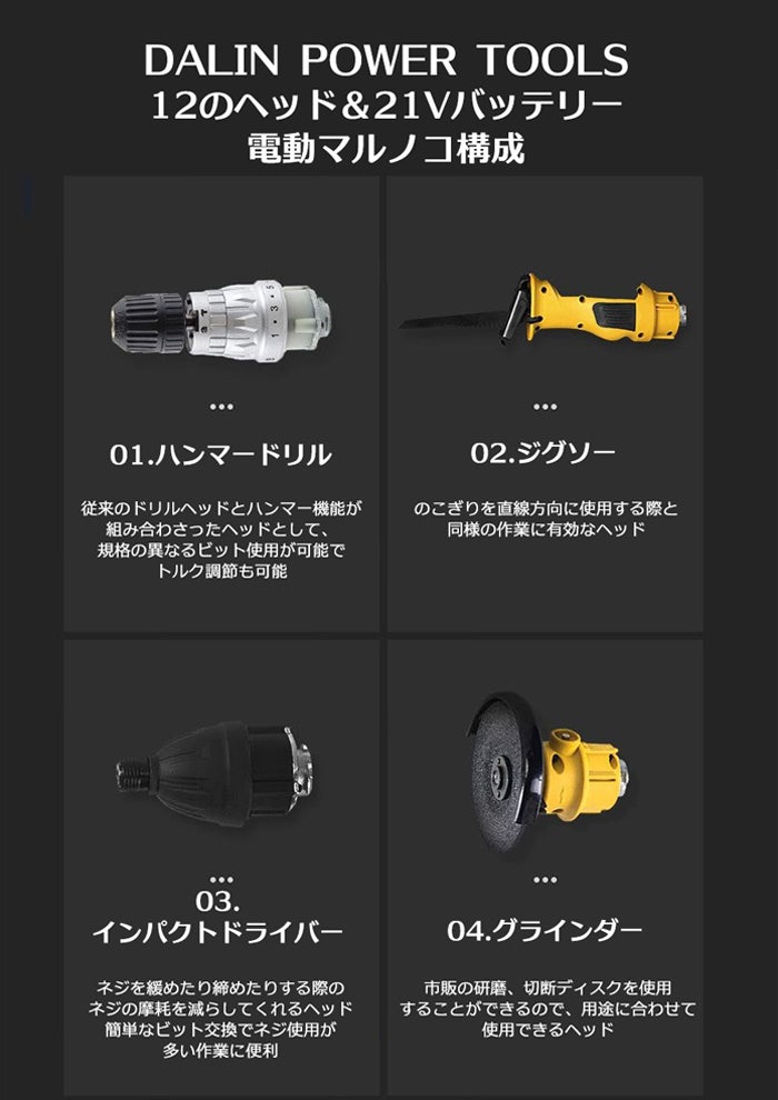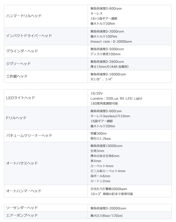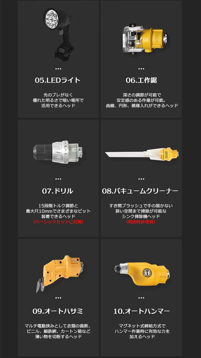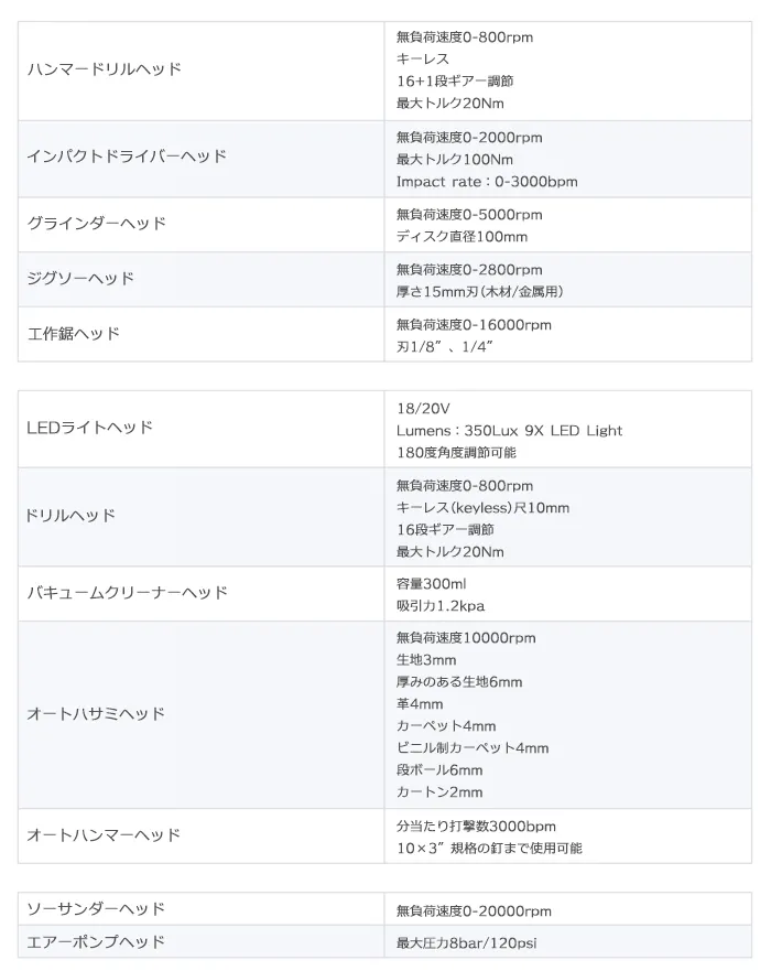 一つの本体に12種類ヘッドを付け替えるだけで様々な作業が簡単に行えるマルチな機能と21Vリチウムイオンバッテリーがより安定して持続使用ができるようなりました。