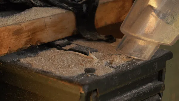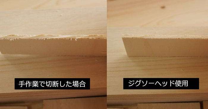 手作業で切断をした場合、木目を痛めてしまったり、おがくずで切断した木材の接着がうまくできない場合がありますが、ジグソーヘッドを使用することで木目もおがくずも少なく滑らかな仕上がりとなります。