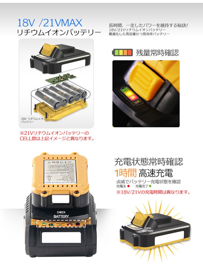 ( ※21Vリチウムイオンバッテリーには10個CELLを採用しました。)