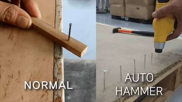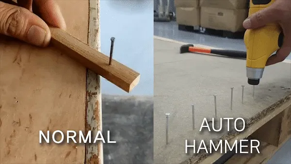 手をケガする恐れのある金槌使いを手を使わずにできるオートハンマーが大きな力を入れずに釘を叩いてくれます。