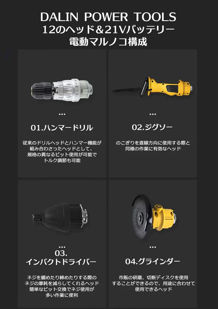 そんな悩みを持つ方々のために作り上げたヘッド交換式電動工具「DALIN POWER TOOLS」をさらにパワーアップした21Vバッテリーと現場の職人さんも使える電動マルノコを追加してご紹介いたします。
