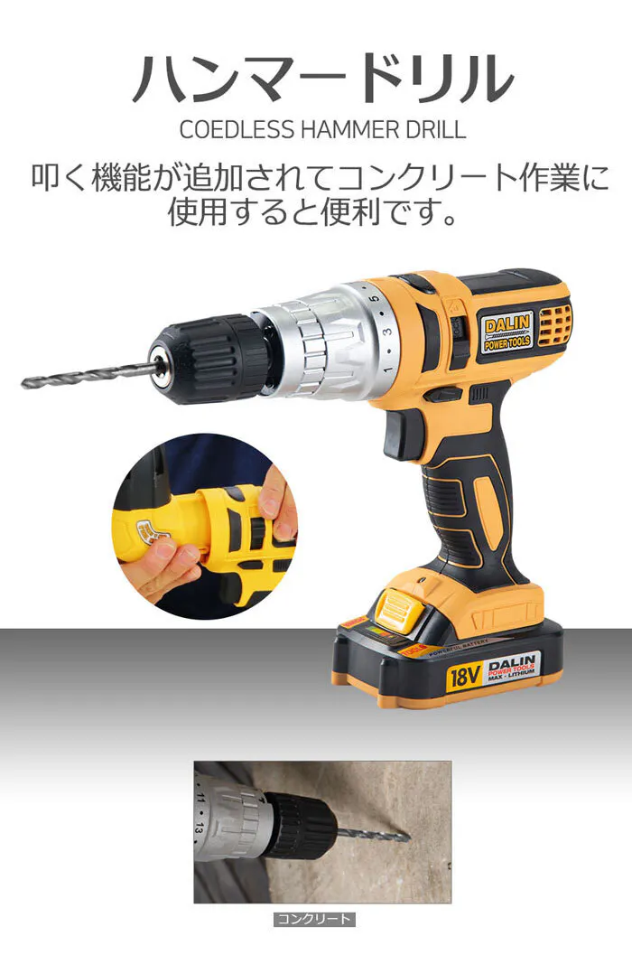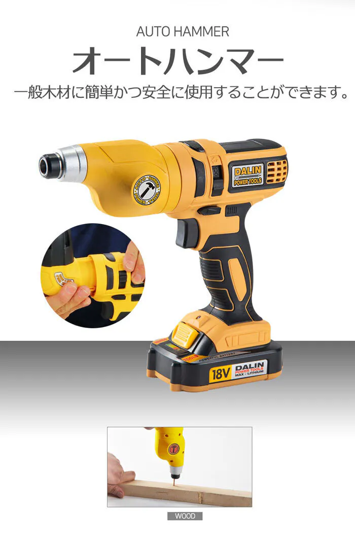 工具使用が多い場所、木材や壁にネジを打ったり、穴をあける時に使用することが多いです。DALIN POWER TOOLSは金槌で叩くような打撃でコンクリートや硬い壁にネジを打つまたは穴をあけるときと木材や鉄材などに穴を開けたり、ネジを閉めるドリル機能を搭載したマストツールです。