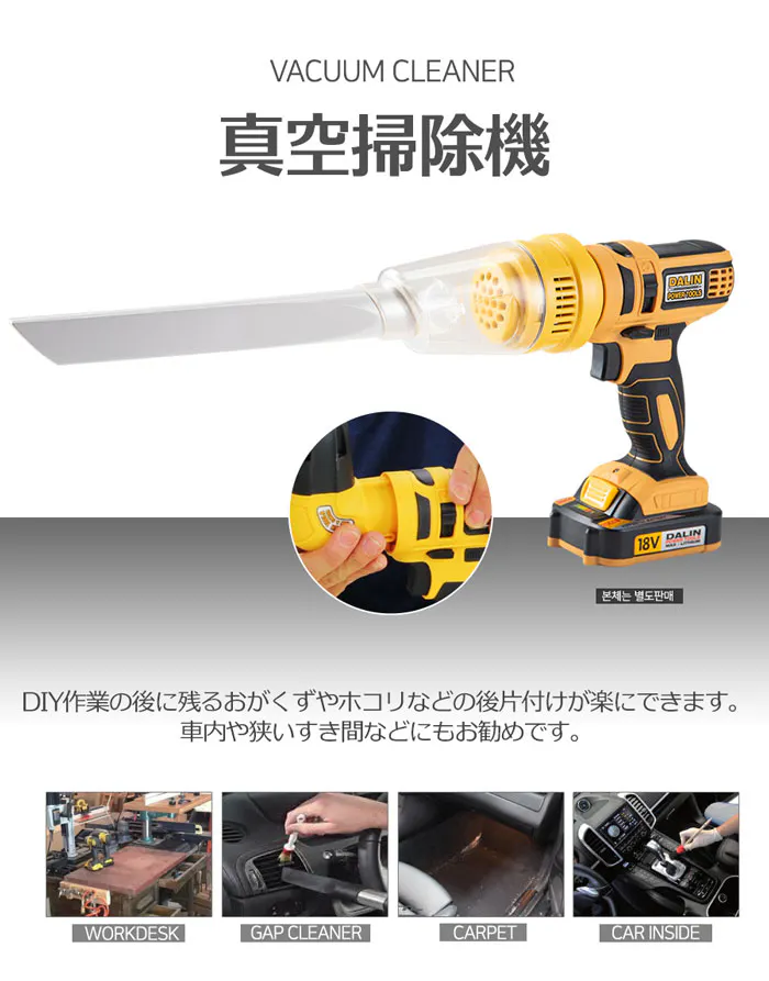 セルフインテリアをする際の木材切断・加工する作業は基本中の基本です。切断したり、穴を開けたり、加工したりすると作業の後におがくずとホコリなどの後片付けで大変な思いをすることが多いです。その場でその都度片付けをするにはハンディークリーナーを別途用意しなければならなかったり、充電をするなど手間がかかってくるものです。そんな手間と悩みが一度で解決できる真空吸引電動工具用掃除機を開発して特許取得(※韓国国内特許)をしました。