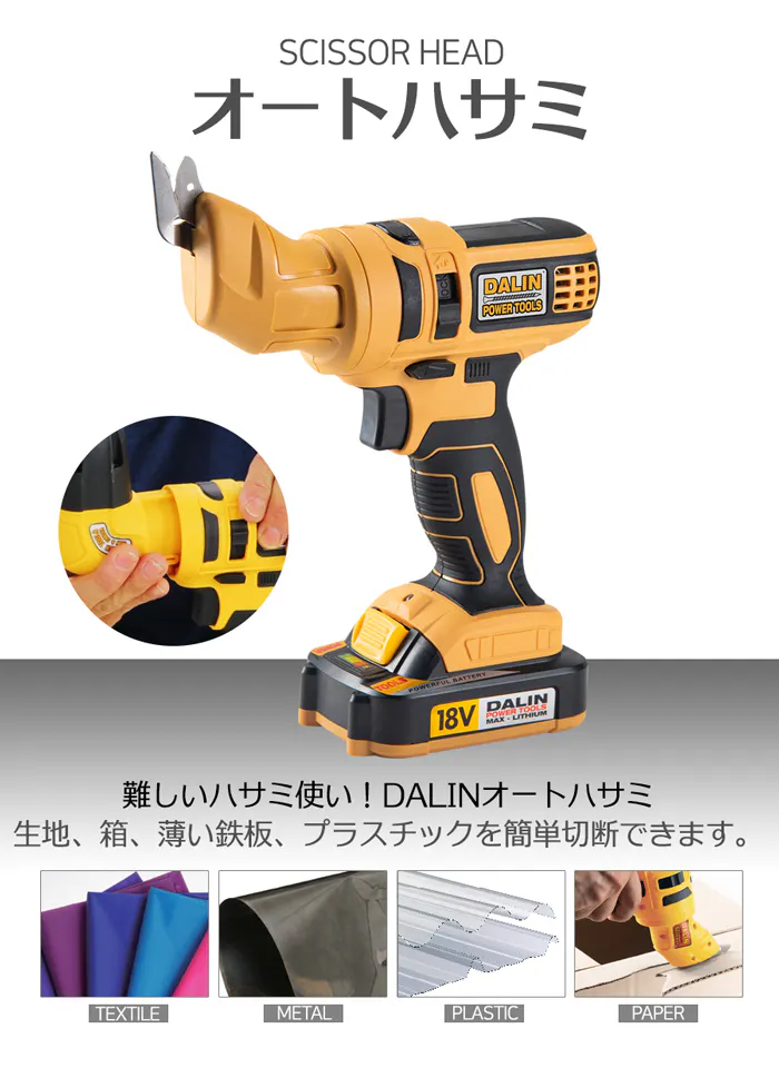 DIY用材料をネット注文したり、ホームセンターなどで購入してくると材料の破損を防ぐためにプチプチ袋や分厚いカートン箱に梱包されてる場合が多くあります。一つ二つ取り外すくらいの作業なら普通のハサミでもできますが、分厚いカートン箱、厚みのある紐、薄い鉄板などで作業を開始する前につかれてしまう経験ありませんか?本体のヘッドを交換するだけで電動ハサミに変身するオートハサミで作業効率を高めてください。