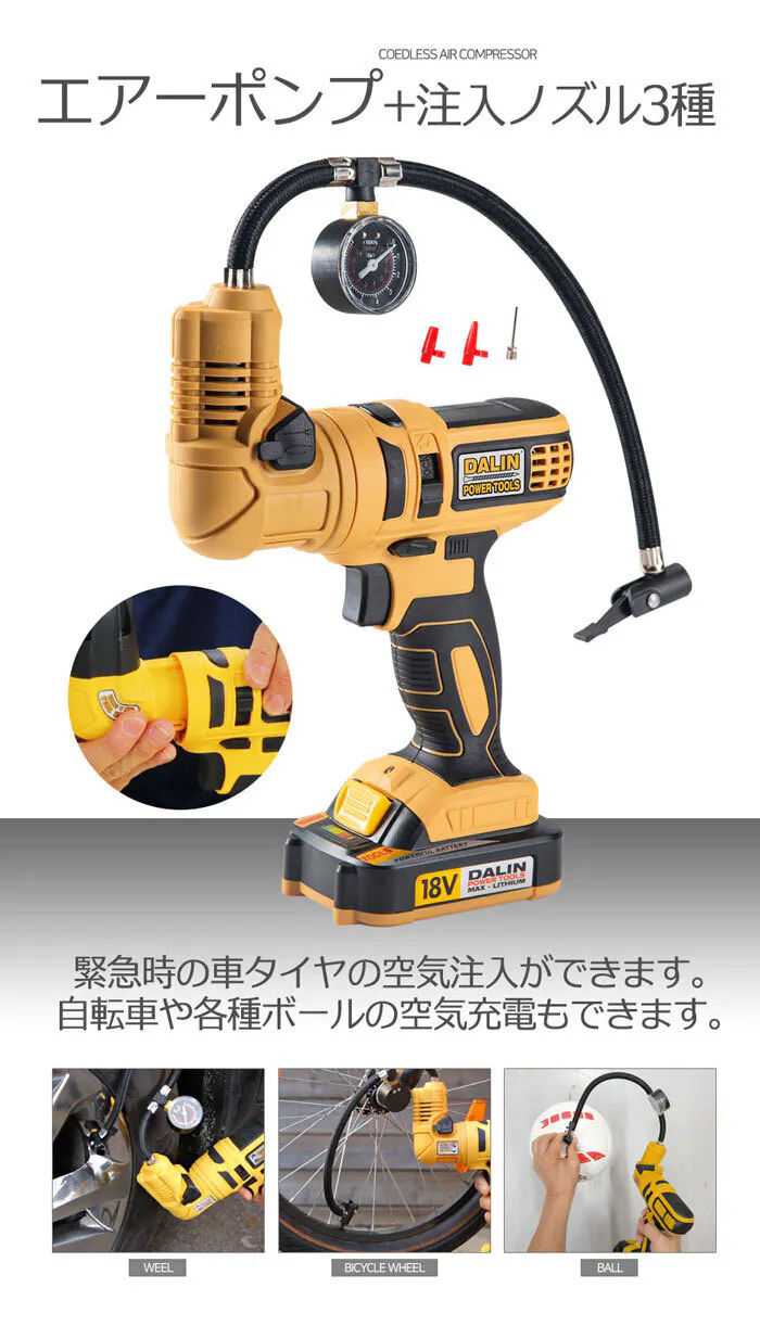 自転車やボールの空気がなくて困ったときにも簡単に空気注入ができるエアーポンプヘッドで車タイヤの空気圧も点検して常に安全走行ができる便利アイテム