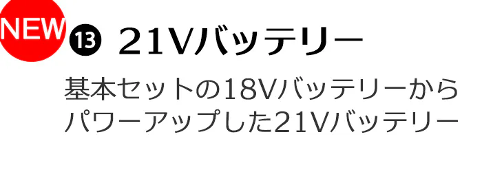 「高容量、高効率の18Vリチウムイオンバッテリーにさらにパワーアップされた21Vリチウムイオンバッテリーが追加されました。」