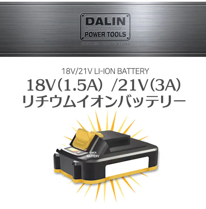 長時間の作業でも一定したパワーが持続する18Vリチウムイオンバッテリー(基本構成)とパワーアップされた21Vリチウムイオンバッテリーが高容量、高効率でDALIN POWER TOOLSの使用をサポートします。