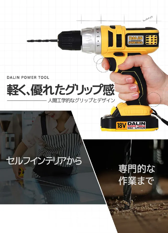 電動工具といえば難しくて使い方がわからないイメージが強いです。しかし、今は大きく変わりました。DIYが人々生活に楽しく、自分好みが演出できる趣味の一種として定着するようなりました。人々のライフスタイルによりたくさんの思い出がご自身で作ることができるように軽く、グリップ感の良いDALIN POWER TOOLSが役立ちます。