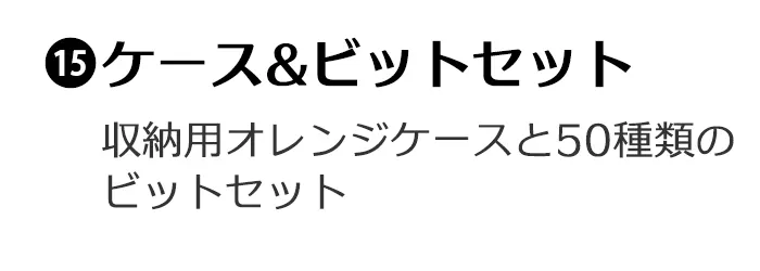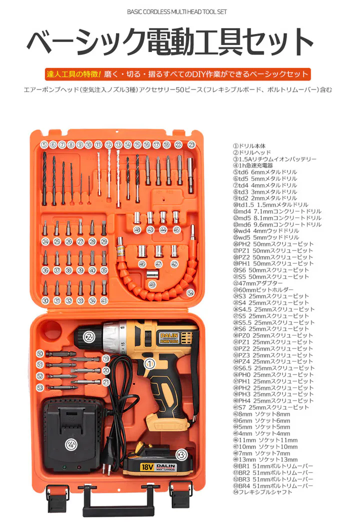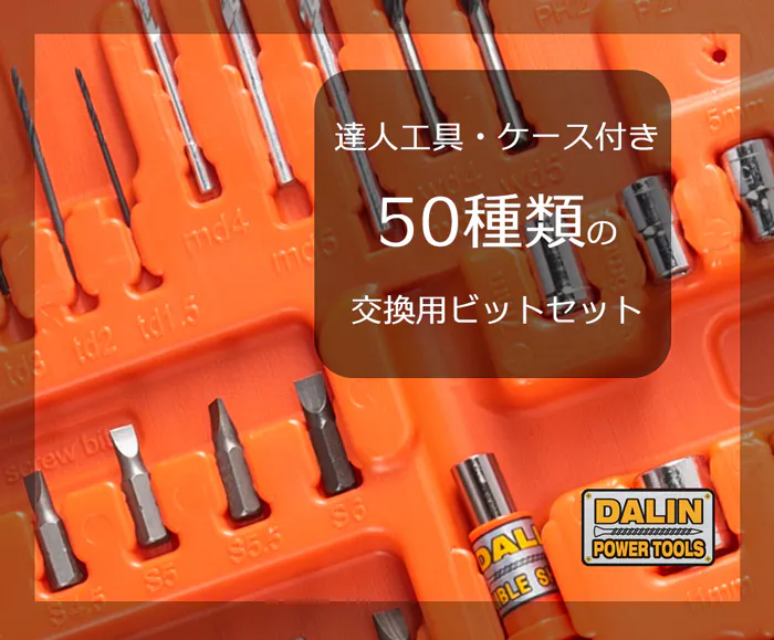 「DALIN POWER TOOLSを簡単かつ大切に収納・保管できる専用オレンジハードケースと50種類のビットがセット構成」