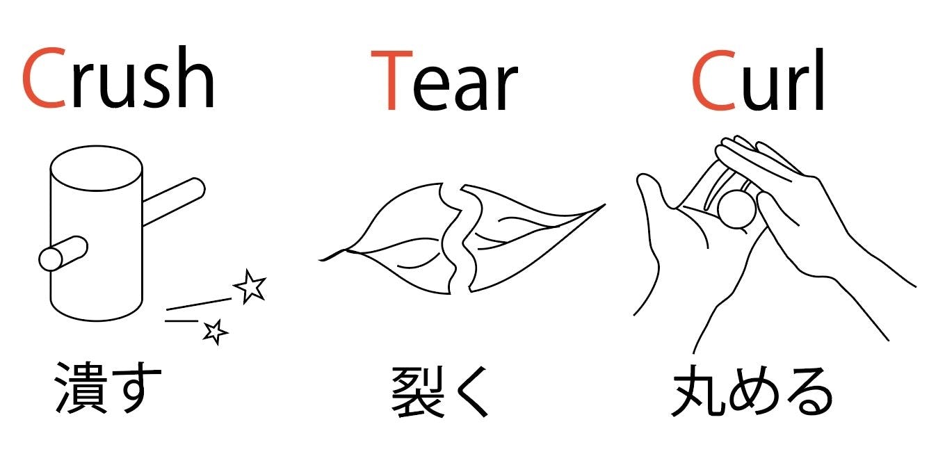 CTCとは、「Crush=つぶす/Tear=裂く/ Curl=丸める」の頭文字を略したものです。収穫した茶葉を紅茶に加工する際、専用の機械を使い、潰し引き裂きながら、丸いつぶつぶの形状に仕上げた紅茶をCTC紅茶と言います。