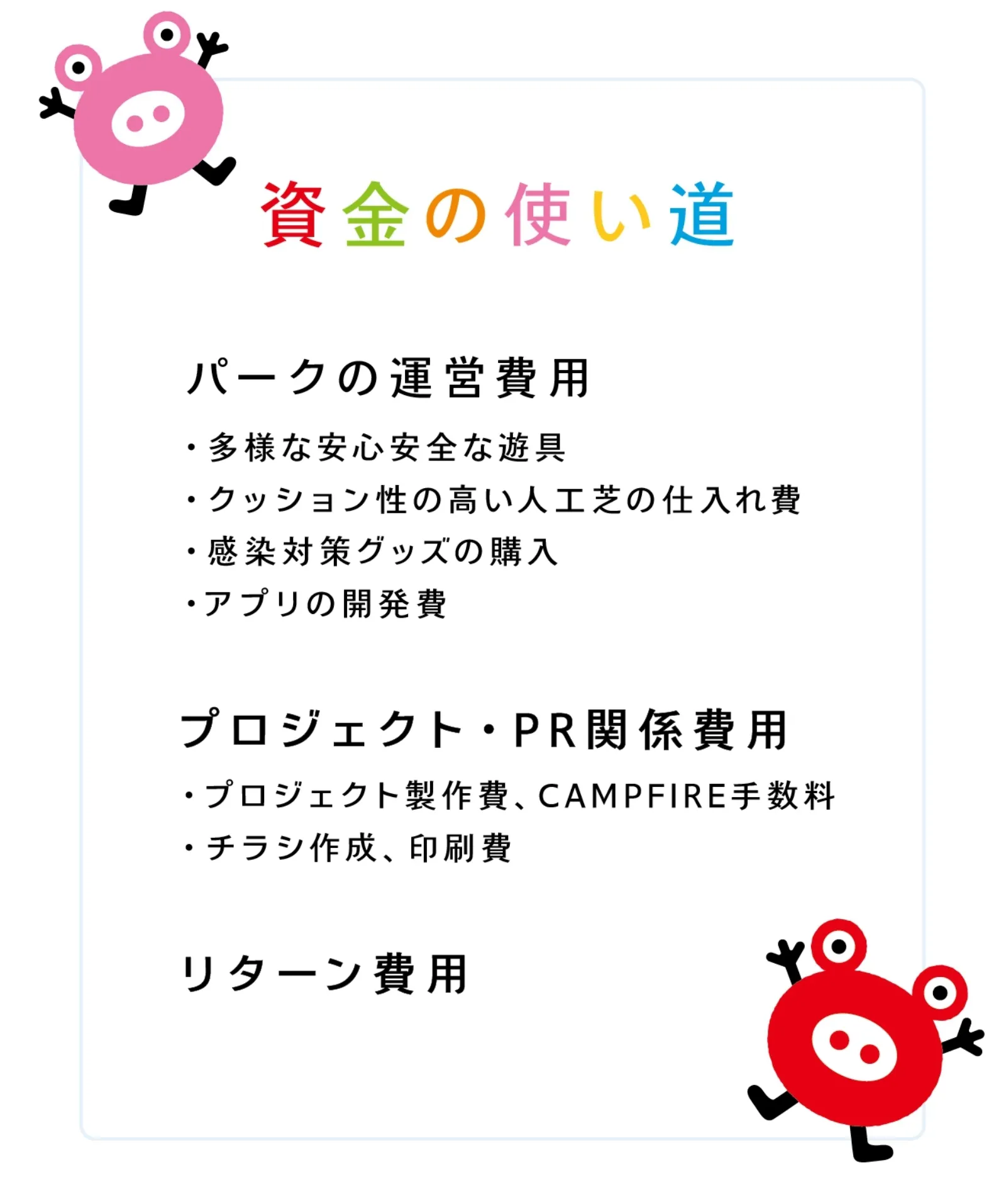 2022/08/03 19:05こんにちは、F.K.Solutions です。この度は、私たちの活動にご賛同、ご支援受け賜り誠にありがとうございました。いただいた支援金はパーク運営に大切に使わせていただきます。オープンから約1ヶ月がたちますが、元気いっぱいに走り回るたくさんのお子様の笑顔を見ることができています。ご支援いただいた皆様へはリターンの発送など詳細につきまして改めてメールにてご連絡いたします。今しばらくお待ちいただけますと幸いです。今後とも当園の活動を暖かく見守っていただきますよう、よろしくお願いいたします。引き続きたくさんのご来園、お待ちしております。F.K.Solutions こどもっちパーク スタッフ一同 もっと見る