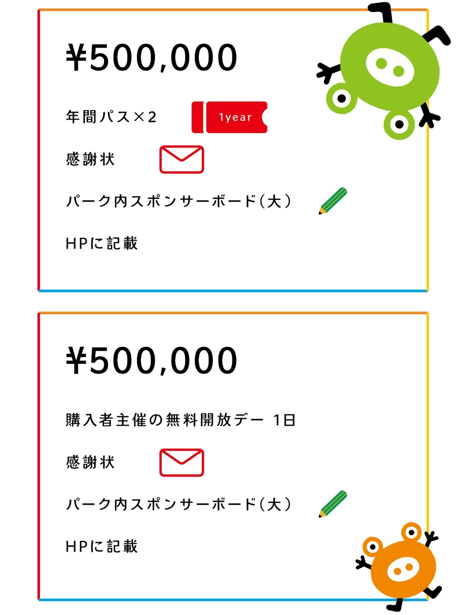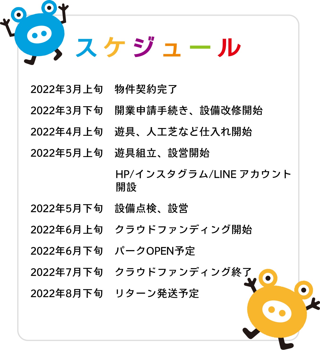 2022/08/03 19:05こんにちは、F.K.Solutions です。この度は、私たちの活動にご賛同、ご支援受け賜り誠にありがとうございました。いただいた支援金はパーク運営に大切に使わせていただきます。オープンから約1ヶ月がたちますが、元気いっぱいに走り回るたくさんのお子様の笑顔を見ることができています。ご支援いただいた皆様へはリターンの発送など詳細につきまして改めてメールにてご連絡いたします。今しばらくお待ちいただけますと幸いです。今後とも当園の活動を暖かく見守っていただきますよう、よろしくお願いいたします。引き続きたくさんのご来園、お待ちしております。F.K.Solutions こどもっちパーク スタッフ一同 もっと見る