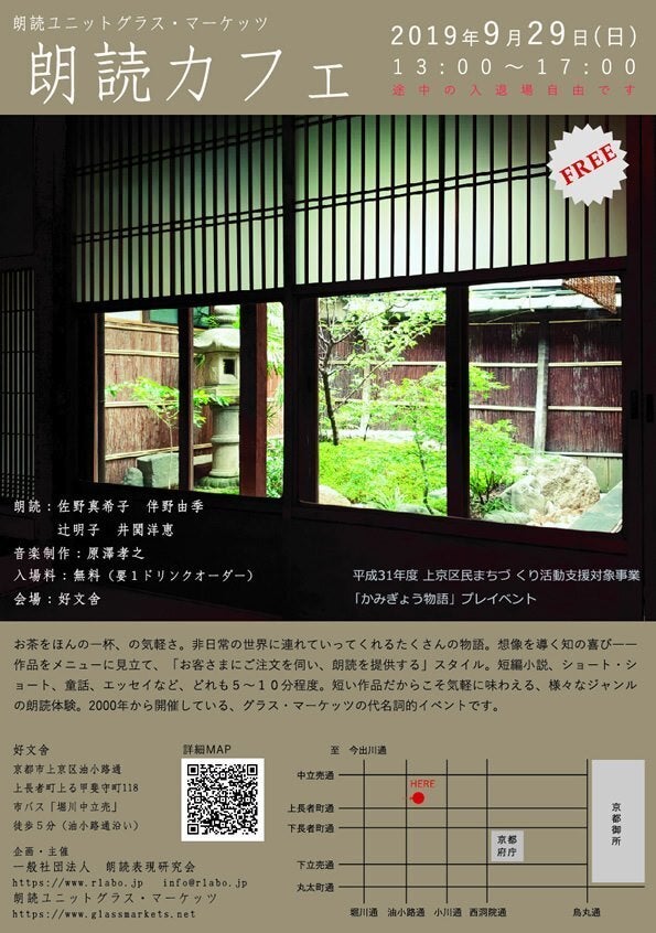 その活動拠点は、2020年7月、京都市にオープンさせた朗読専用劇場rLabo.(アールラボ)。朗読イベントの企画をはじめ、ワークショップや勉強会など、朗読する場、朗読に触れる場を広く提供しています。