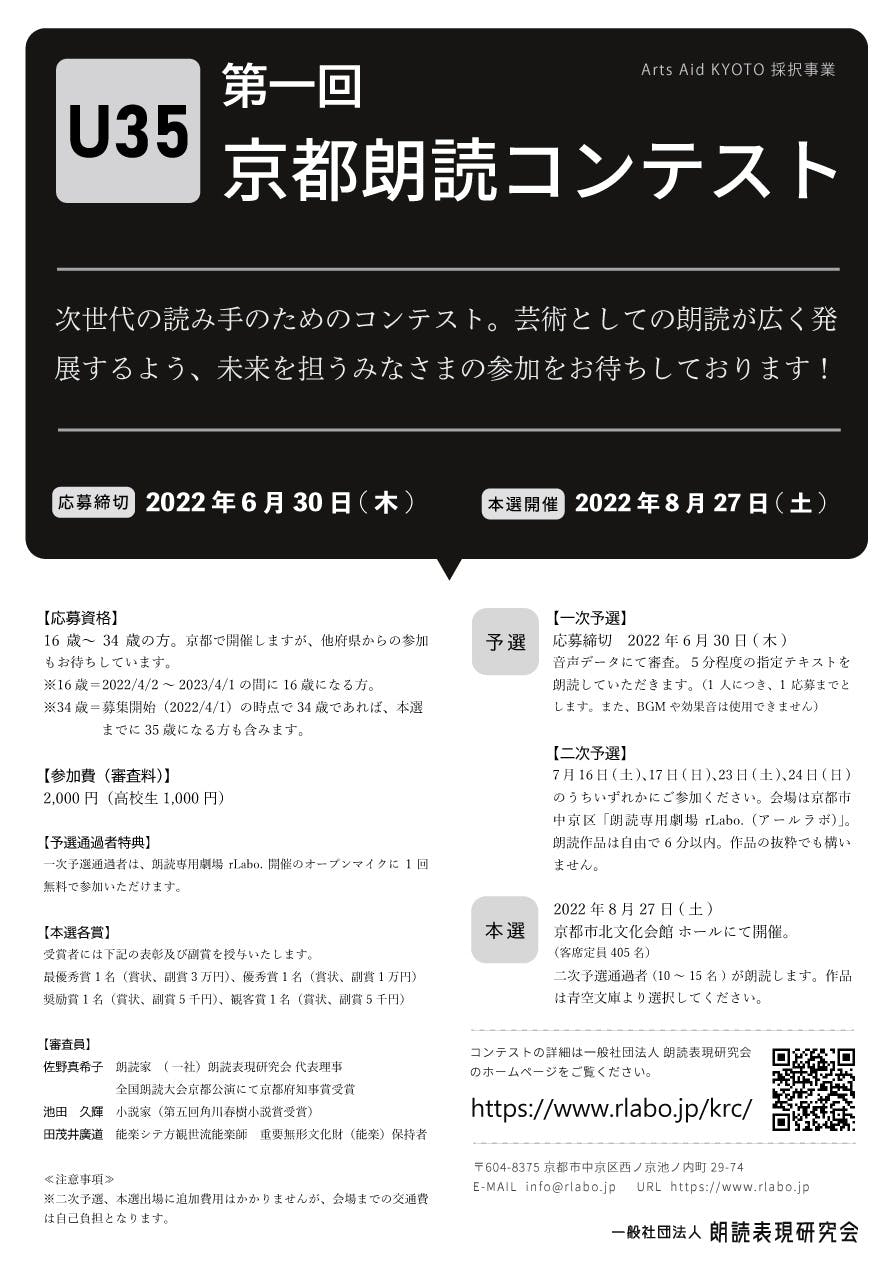 活動拠点である「朗読専用劇場アールラボ」をはじめ、「U35 第一回京都朗読コンテスト」に関して興味をお持ちいただけましたら、ご支援のほどよろしくお願いいたします。
