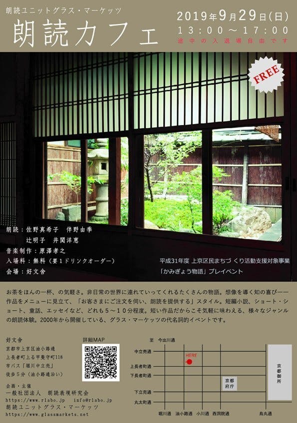 自身が主宰する「朗読ユニット グラスマーケッツ」で20年の朗読経験を持ち、朗読教室や大学での講師など、多方面に渡って活動している朗読家。(2015年には、全国朗読大会京都公演にて「京都府知事賞」を受賞)https://www.glassmarkets.net/