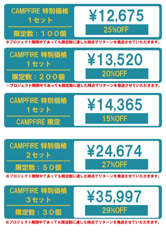 ※想定を上回る皆様からご支援を頂き、量産体制を更に充実させることができた場合、一般販売価格が予定価格を下回る可能性があります。