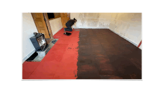 • 4面の壁全てが異なる風合いに。これも全て和紙です。床の和紙に漆塗りをしている様子。