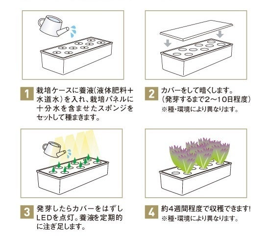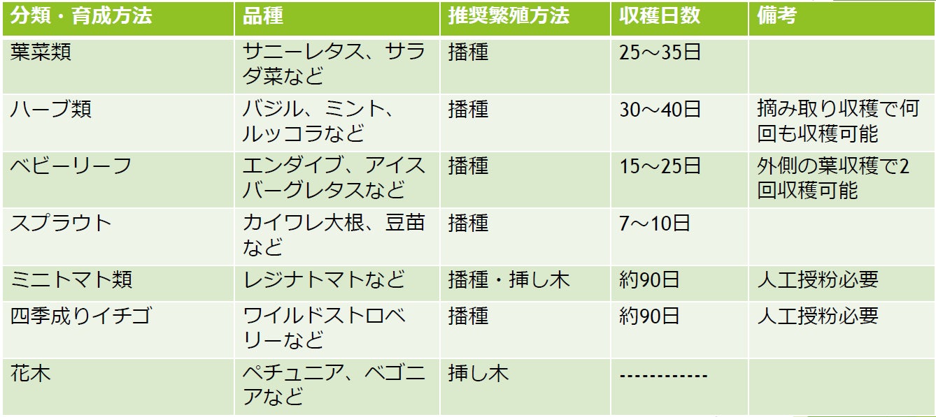 ※ホウレンソウなど育たない植物もあります。植物に必要な点灯時間(光の量)は、設置環境によっても異なります。成長が遅い場合は、点灯時間を長く設定してください
