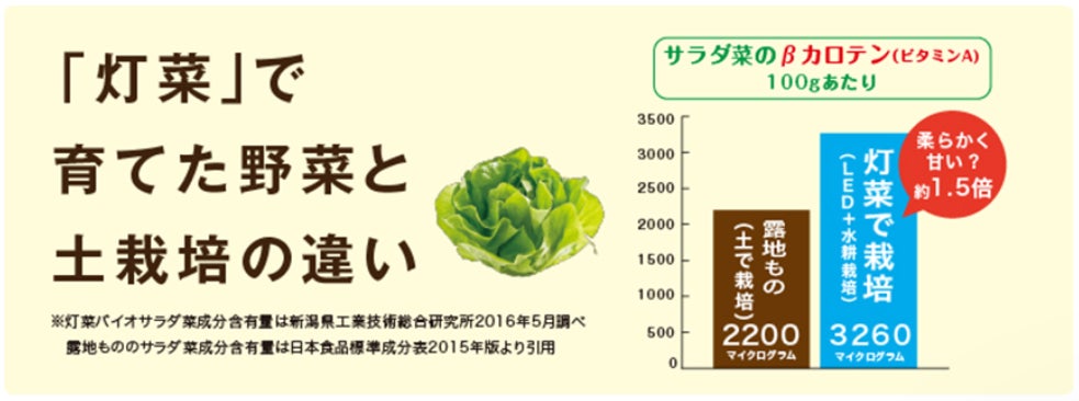 LEDで水耕栽培したサラダ菜は、βカロテン(ビタミンA)が増大する傾向にあります。 Akarinaで栽培したサラダ菜のβカロテン含有量は、日本標準成分表に掲載されている路地ものサラダ菜の約1.5倍。