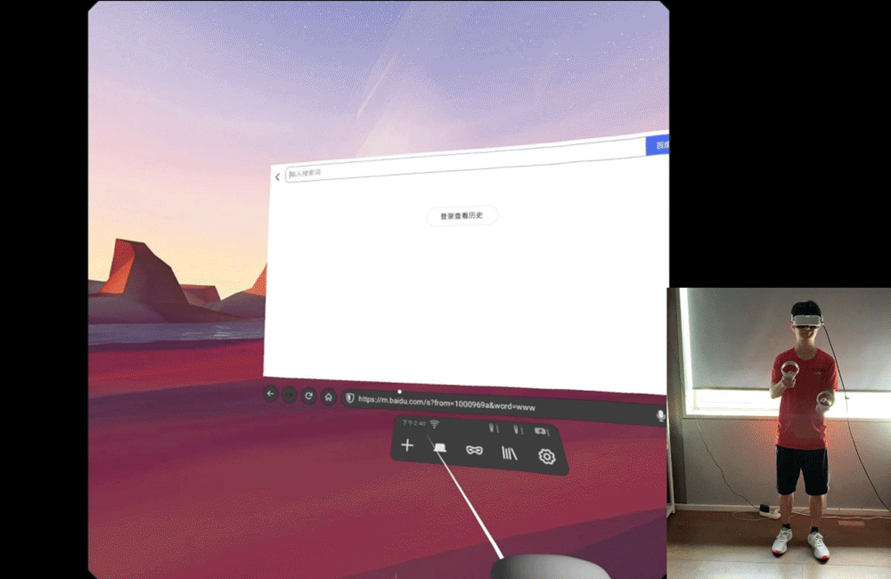 徐々に明るくなる室内環境でも、arpara AIO 5Kのコントローラーは安定性を維持することができます。Firefox Realityブラウザ]を使用した場合、ジッター、ドリフト、フレームロス等は発生せず、以下のようにトラッキングも良好に動作しています。
