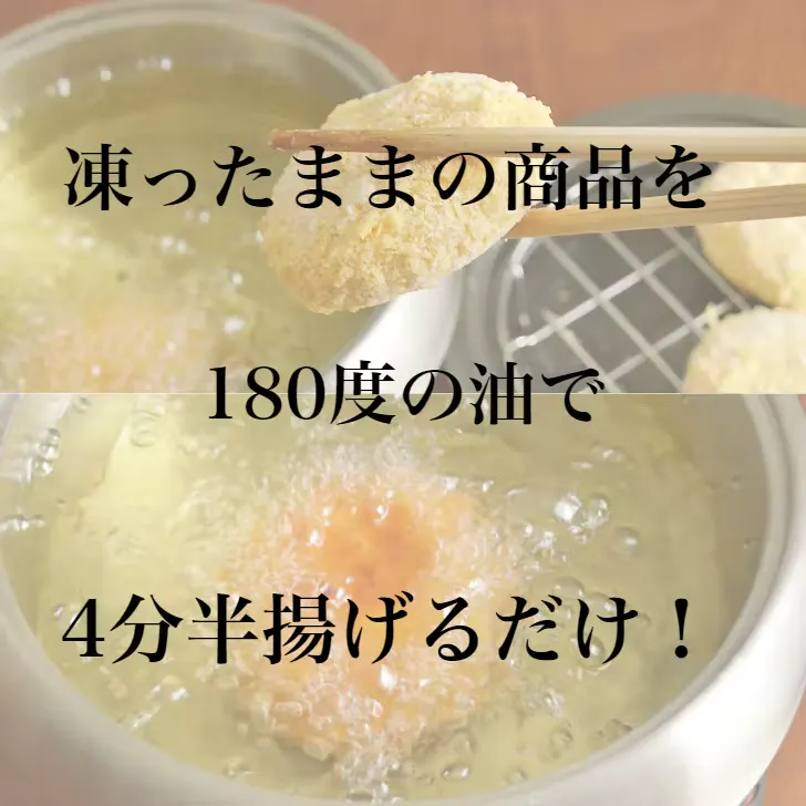 ・170度で5分もしくは180度で4分30秒凍ったままの商品を油で揚げてお召し上がりください。