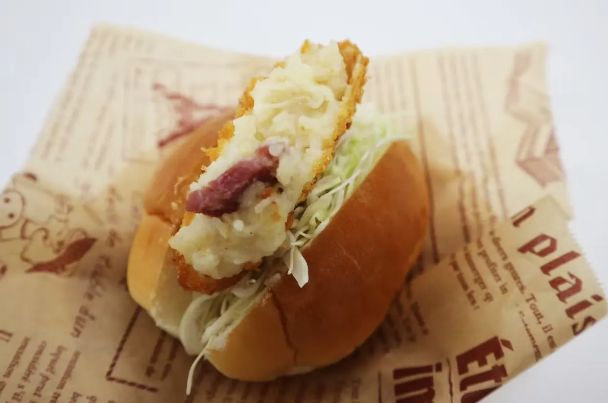 焙焼生パン粉で包まれたサックリとした衣、淡路島産玉ねぎの甘さと、六甲山麓牛乳とこだわりポテトをベースにし、ベーコンとチーズのうま味がぎゅっと濃縮されたソースが口の中でとろ~っととろけます!