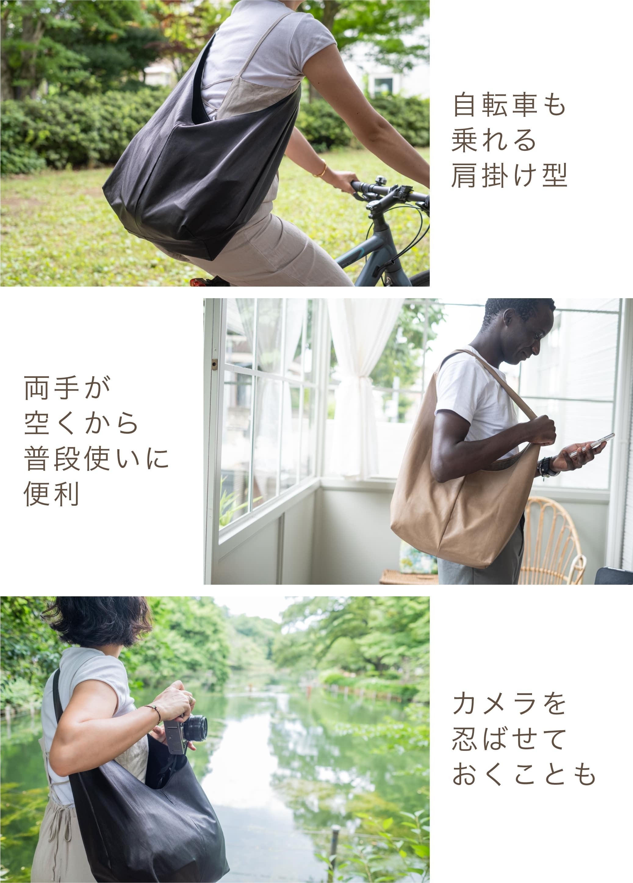 トートタイプなので、肩掛けでも使えます。肩掛けすれば両手が空いてラクラクです。自転車に乗っても使えるからとても便利です。