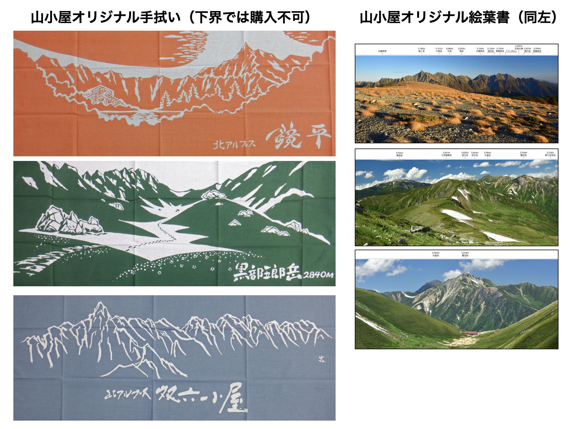 この3つの山小屋は同じ経営者によって営まれており、北アルプスの中でも人気の高い山小屋です。オーナーから手拭いを提供していただくことも了解を得ています。手拭いの料金はオーナーに支払います。