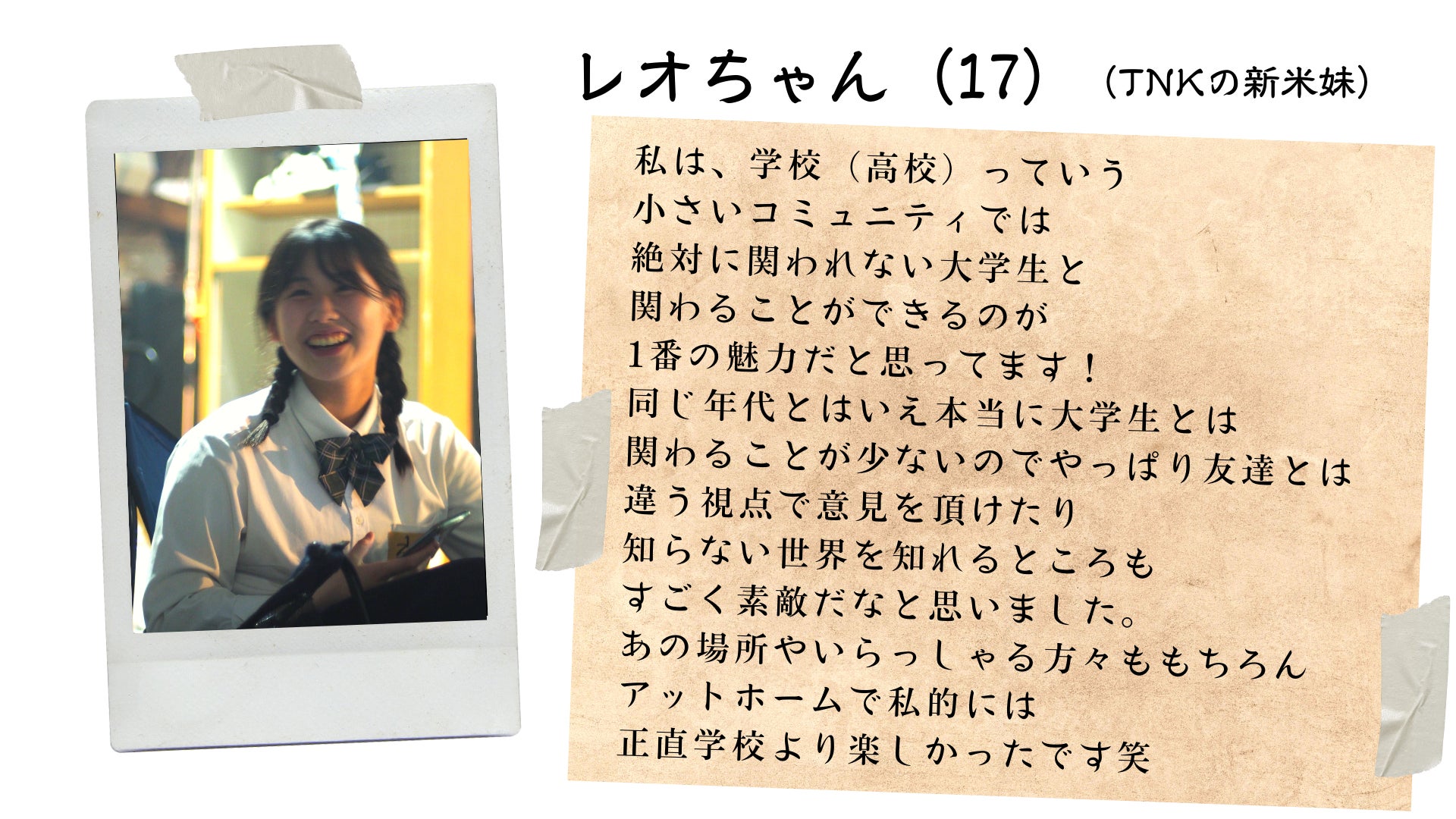 彼らは全員現役学生のエンターテイメント企業。カードゲーム開発や学生時代をもう一度体験できるイベント『青春奪還作戦』など、学びとエンターテイメントを掛け合わせた企画を生み出している。TNK発足当時から遊びに来てくれていて、いつも力になってくれる超絶助っ人集団!TNKのパートナーとしてこれからも助け合っていきます!新しい世代を彼らと共に盛り上げます!