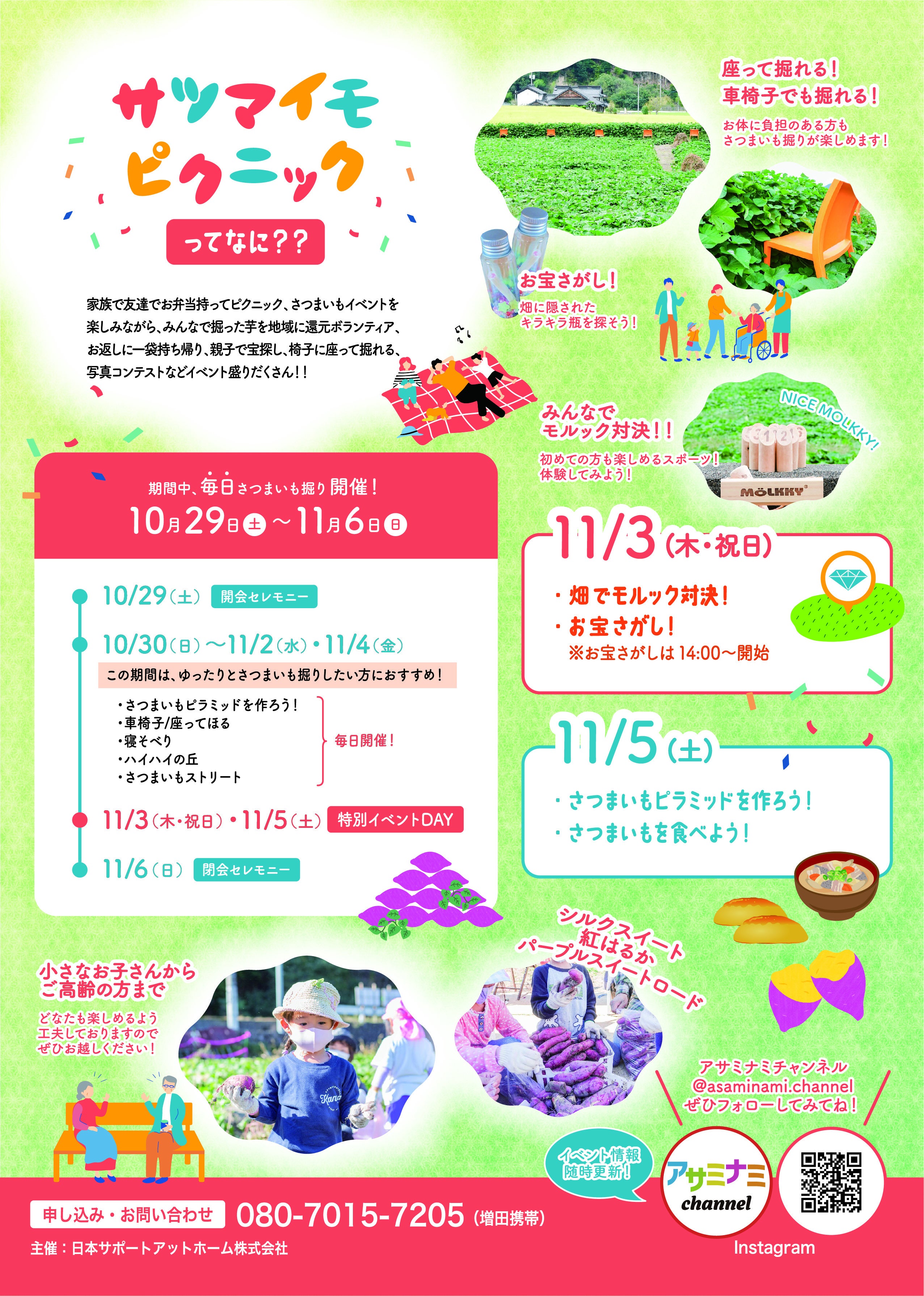 イベント週間が終わり一区切りしましたので活動報告をさせてください!■10/29(土)~11/6(日)の9日間でイベントを開催しました。事前予約が250名を超え、ご来場者数は延べ約300人と大盛況&大成功でした!■11/7(月)~11/13(日)で残ったさつまいも(お宝探しの会場等)を掘り上げました。会場の後片付けまで完了しました!■これから12月にかけてリターンの返送作業に入っていきます!みなさまと一緒につくった空間=さつまいも畑は、最高の空間でした。年齢や障がいの有無に関係なく、誰もが自然に楽しんでおられました。本当にありがとうございました。今後はユニバーサルデザインの“ひろば”へと展開していきます。 願わくば今後も関わりを継続して頂いて“ひろば”としてに成長した際には『皆さんのMyひろば』として使って頂けると嬉しいです。ありがとうございました。Instagram(インスタグラム)→→→ mashida.supportathomeイベント期間中の写真を公開していますので、たくさんの笑顔を是非ご覧ください!さいごに、表紙の写真はこのイベントを一緒に企画したメンバーです。みんな最高でした!! お宝探しどすこい大いも賞寝そべりふたり仲良く畑でモルック対決!!