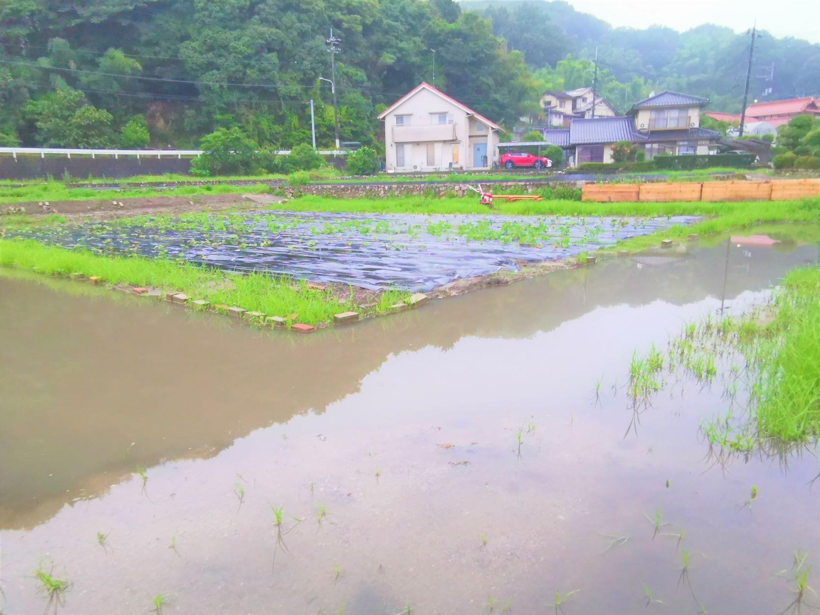 雨上がりの畑はまるで池。たくさんのカエルが嬉しそうに泳いでいる。よかったね!いやいやここはユニバーサルデザインのさつまいも畑。カエルの楽園ではない。雨上がりに治水工事実施。ジャブジャブ勢いよく排水が進む。明日どうなっているか、楽しみ。