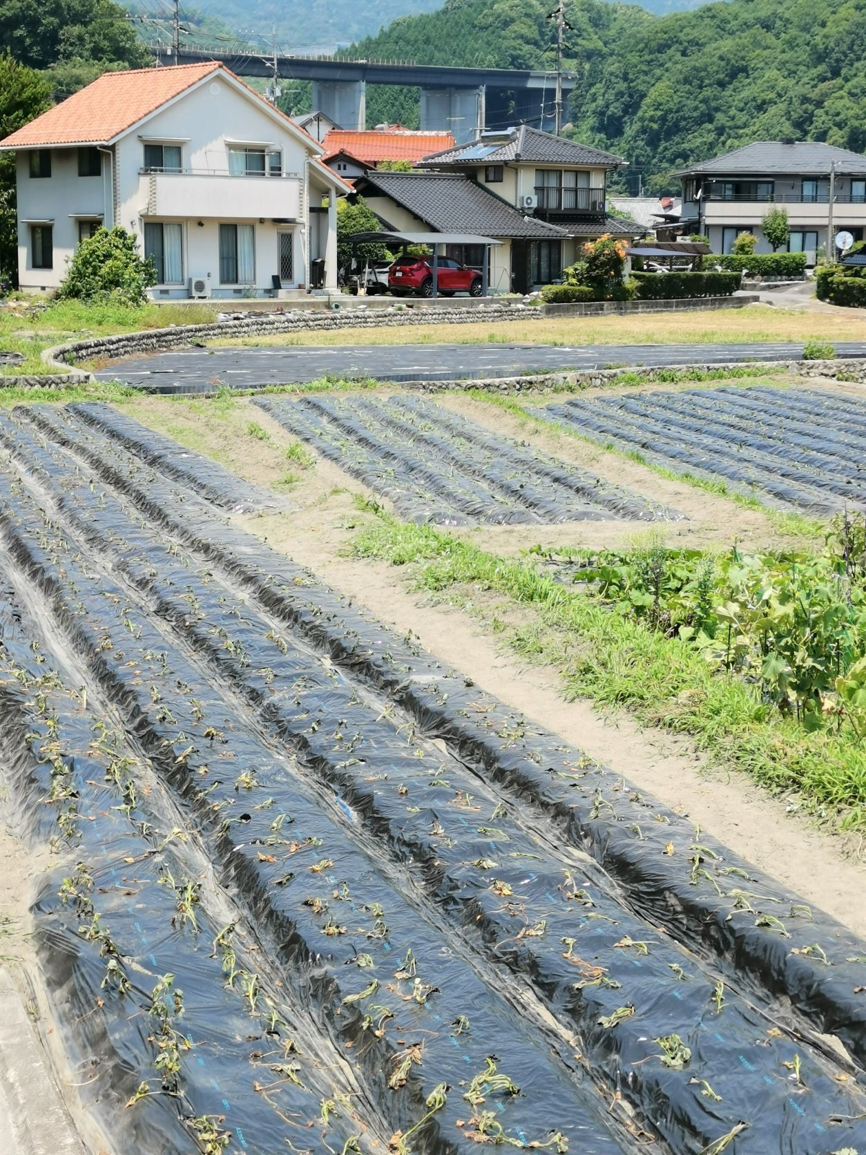 暑いなかでの苗の植付け。マルチ=黒いビニルはフライパン状態。ここ数日はカンカン照りで土は砂風呂状態。苗の茎の部分が焼けたようにカラカラなってしまっている。雨乞いするが雨雲レーダーではどうも降らなさそう。何とか苗を助けたい。しかしここには水道がない。そうだ!じょうろがある。水やりを何往復しただろうか。20時に真っ暗になり終了。そして翌日、大雨。嬉しくも悲しくやっぱり嬉しい。