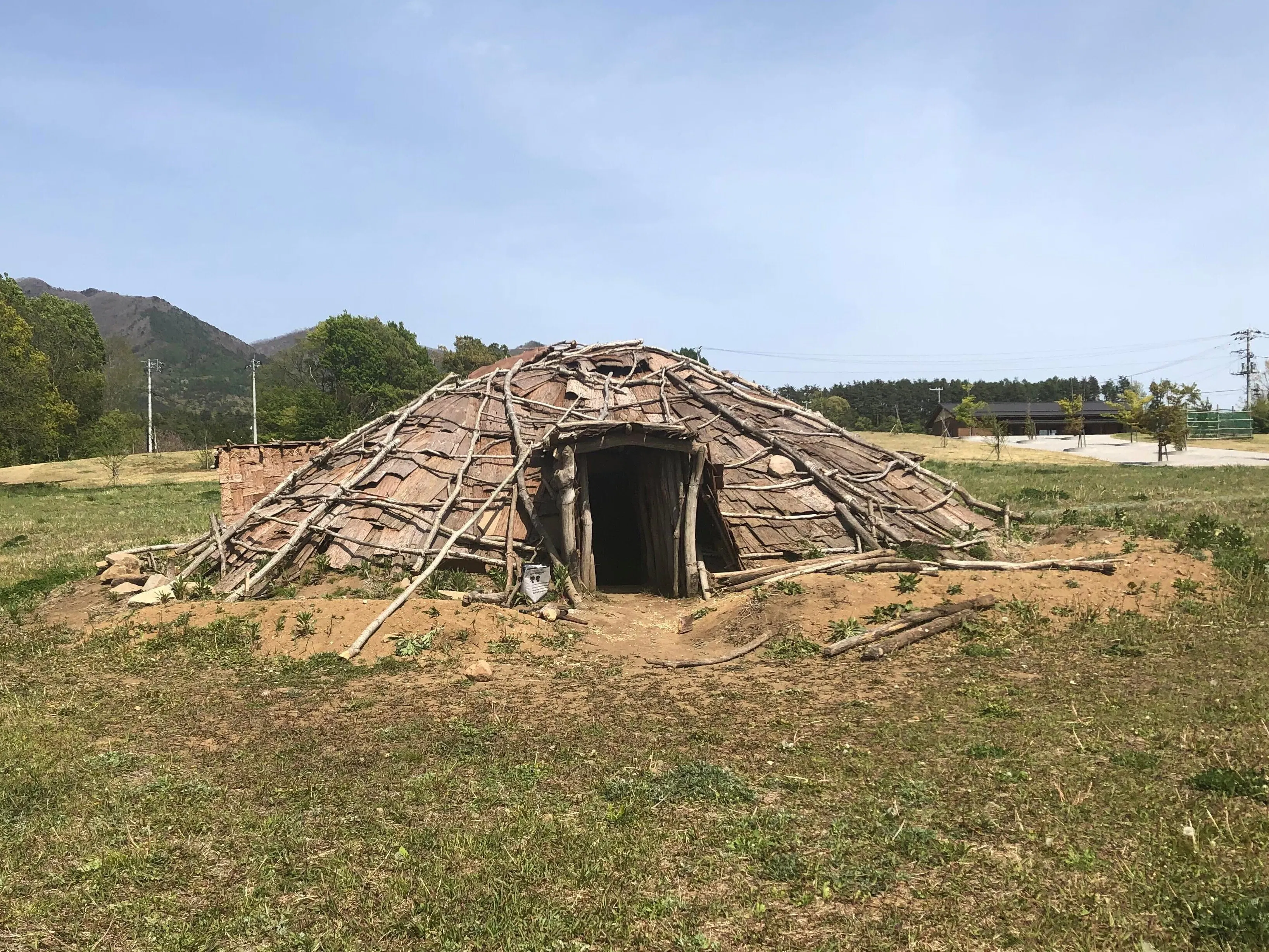 この写真の竪穴式住居は実際に縄文おじさんこと黒田さんが、自作の石斧で切り出した木材を使用して作られています。確認したところ返礼品の竪穴式住居は石斧での制作はちょっと厳しいとのことでした…。