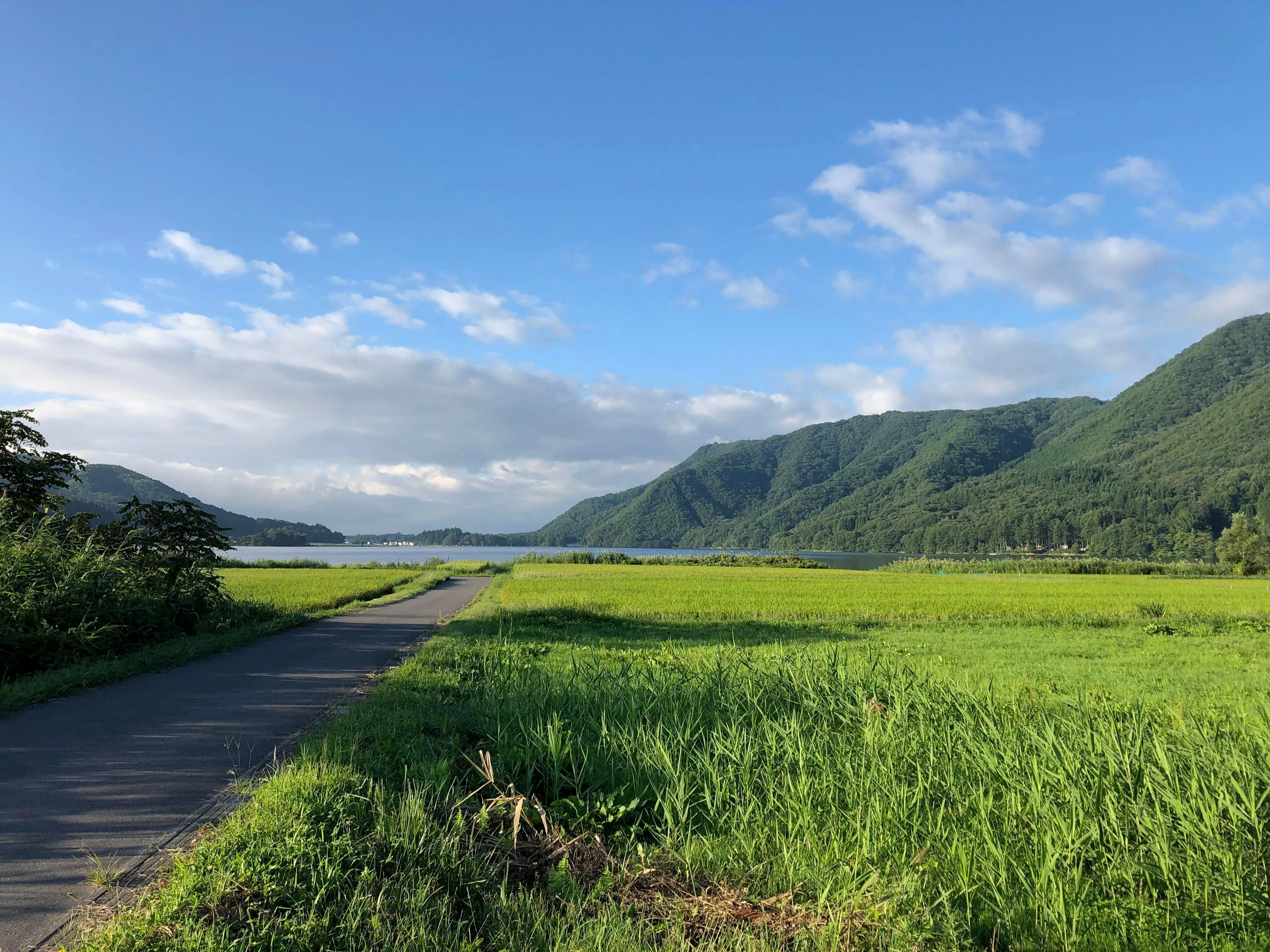 と、どこまでも続く尾根が美しくて そばにある木崎湖には朝5時に霧が立ち上り、