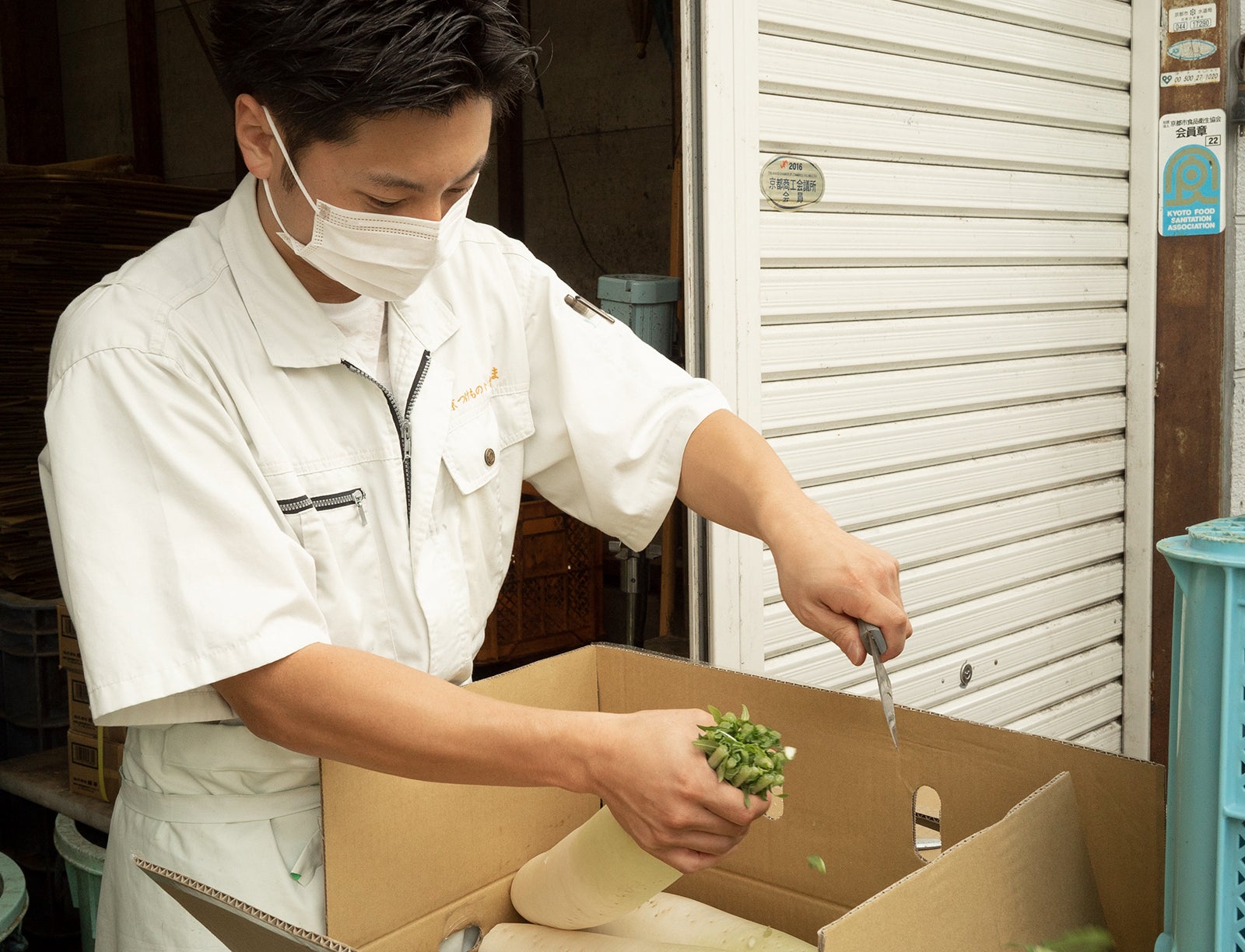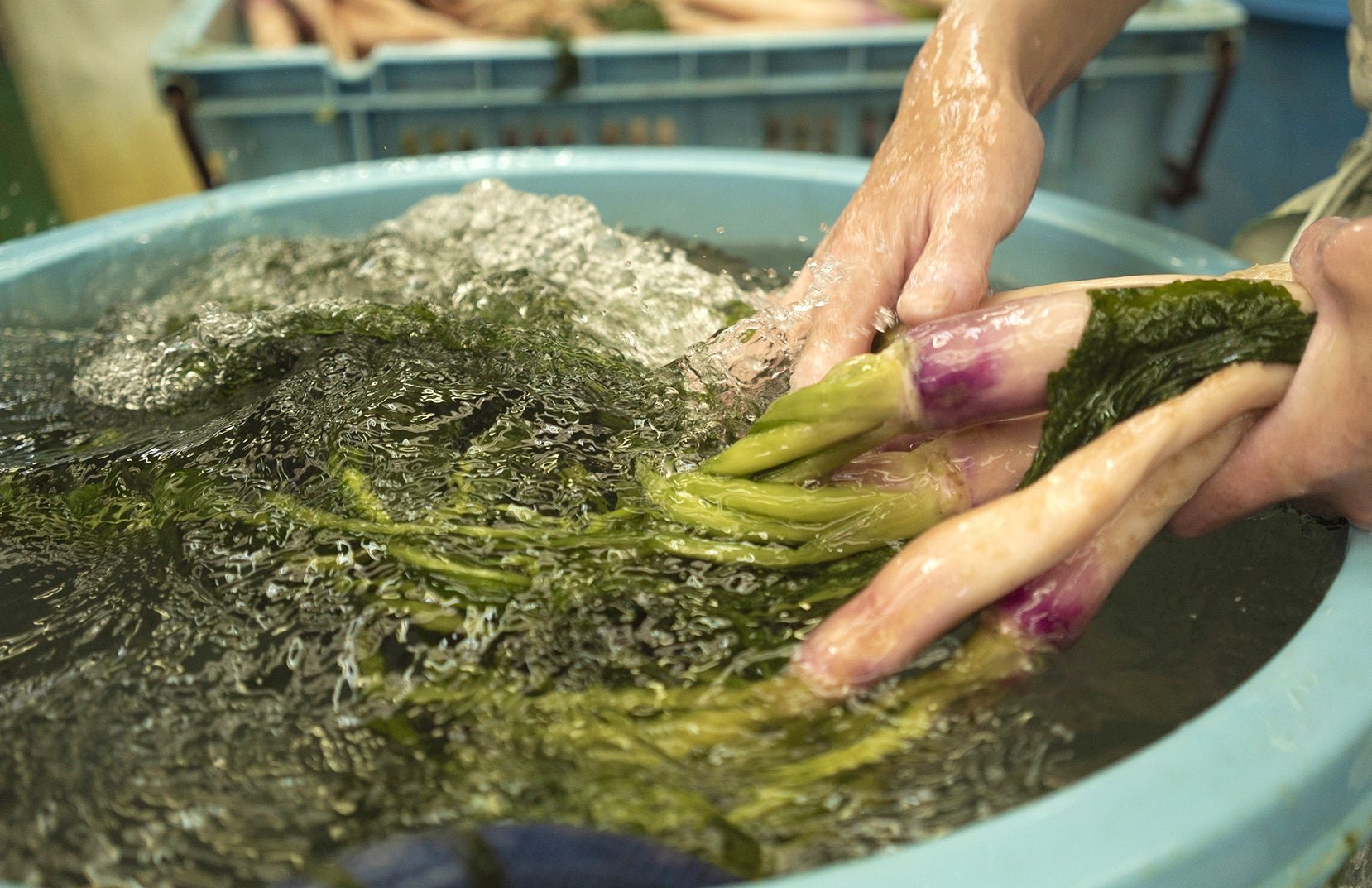 かたやまのお漬物の原菜はすべて国産。姿良し、味良し、鮮度良しで、グレードの高い“秀”等級の野菜を主に使用しています。健康のことを考えて調味液も控え、下漬け・本漬けをしています。