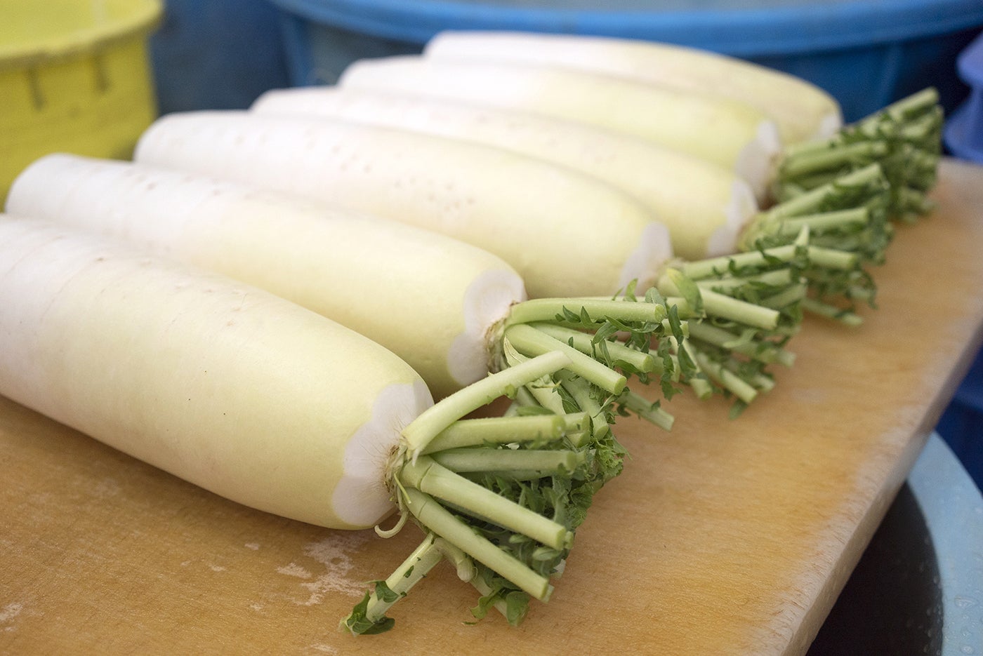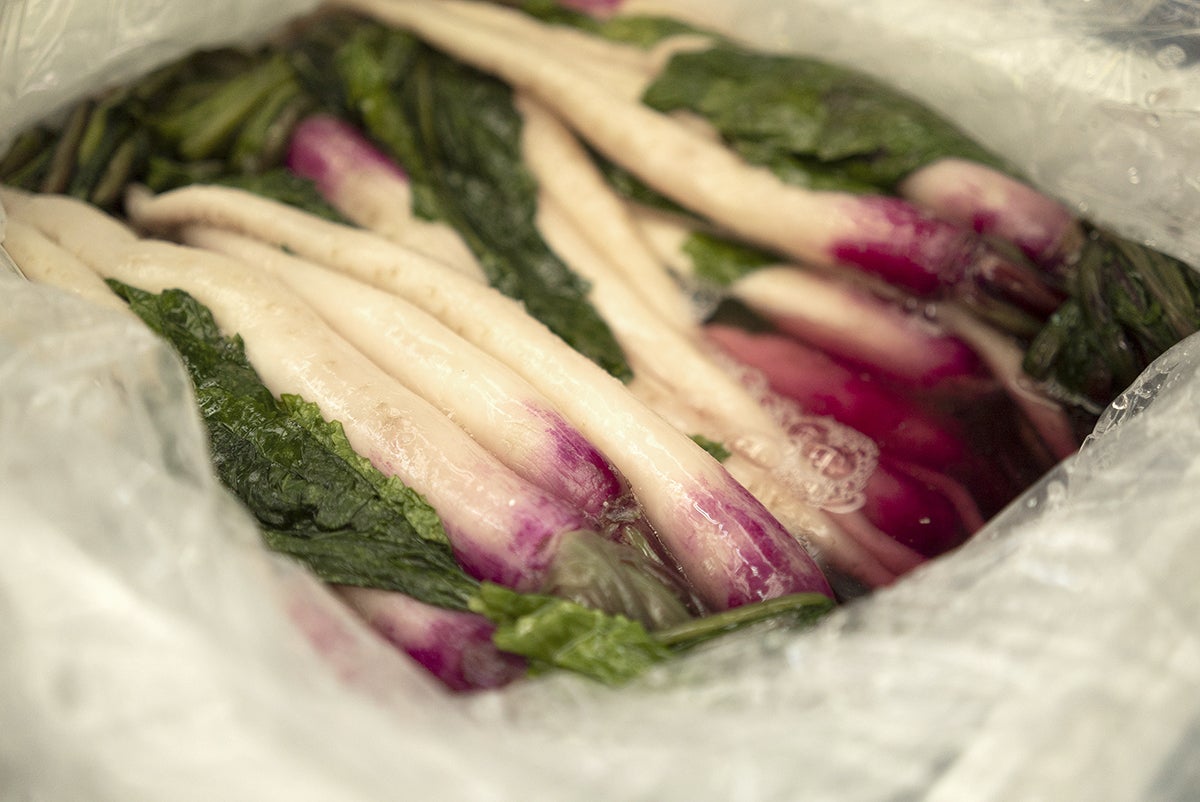 日野菜はかぶの一種で、滋賀県蒲生郡日野町が発祥の伝統野菜です。細い大根のような形で茎の部分は鮮やかな紫色。独特の風味と辛味があり、西日本を中心に漬物として親しまれています。
