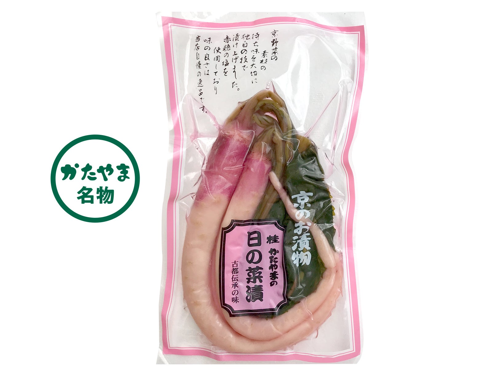 かたやま名物「日野菜(ひのな)漬け」2個入り。日野菜ミックスピクルスと「京つけもの かたやま」の人気お漬物5点を合わせた贅沢な3,000円(消費税・送料込み)のセットです。